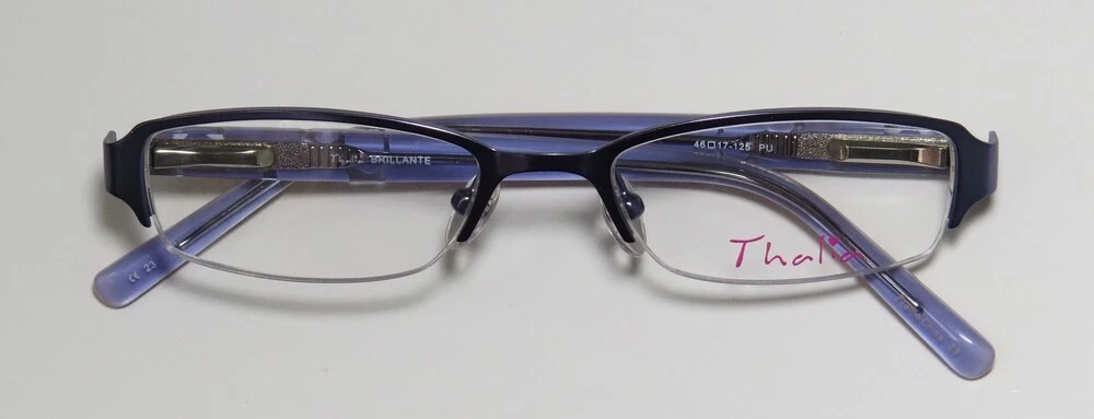 Thalia Brillante Eyeglasses - Surplus Bargains Welcome to our store | contact us - Eyeglasses - - Sunglasses - - Reading Glasses - - Eyewear Cases - Thalia Brillante Eyeglasses The frame is sold with demo lenses that have a logo stamped on them in ink. The frame can be fitted with real lenses at most optical stores. This frame provides comfortable fit and flatters a variety of face shapes. These eyeglasses are made of metal and high quality, durable acetate plastic. The frame has spring hinges. Spring hinge temples prevent you from stretching the fit of your glasses and ensure that they remain intact and not become loose or out of shape. Please keep in mind that original case is not included with this frame. However, we will include a generic hard case or pouch at no extra charge to keep your eyeglasses protected. This is an authentic piece of eyewear acquired directly from the manufacturer. Please feel free to ask any questions you may have about this item. We have more similar items for sale listed in our eBay store. Condition : New Brand : Thalia Style : Brillante Size : 46-17-125 Lens height : 23 mm Color code : pu Frame color : purple / beige Spring hinges : yes Hard case : generic MSRP : $95.00 About STORE CONTACT US if you have any questions or concerns about our eyewear products or online shopping experience. Your feedback is valuable to us, and we are always here to assist you. quick links Listings Contact Us