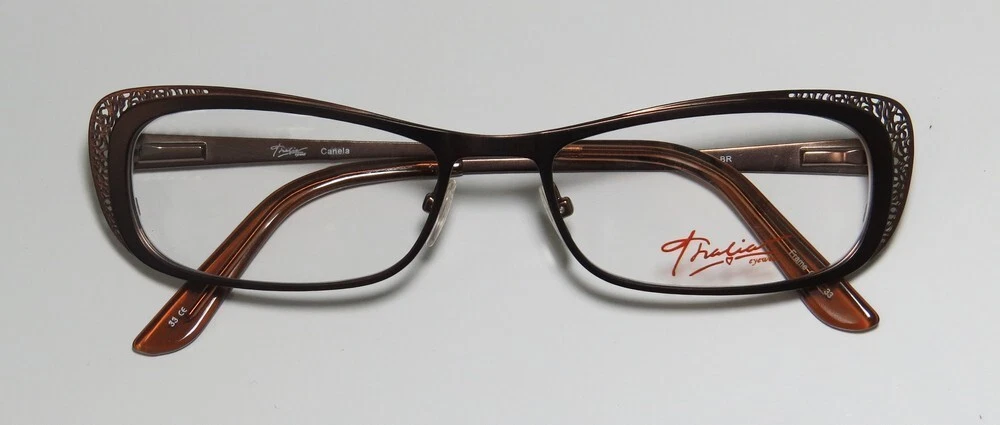 Thalia Canela Eyeglasses - Surplus Bargains Welcome to our store | contact us - Eyeglasses - - Sunglasses - - Reading Glasses - - Eyewear Cases - Thalia Canela Eyeglasses The frame is sold with demo lenses that have a logo stamped on them in ink. The frame can be fitted with real lenses at most optical stores. This frame provides comfortable fit and flatters a variety of face shapes. These eyeglasses are made of corrosion resistant and strong metal. The frame has spring hinges. Spring hinge temples prevent you from stretching the fit of your glasses and ensure that they remain intact and not become loose or out of shape. Please keep in mind that original case is not included with this frame. However, we will include a generic hard case or pouch at no extra charge to keep your eyeglasses protected. This is an authentic piece of eyewear acquired directly from the manufacturer. Please feel free to ask any questions you may have about this item. We have more similar items for sale listed in our eBay store. Condition : New Brand : Thalia Style : Canela Size : 54-17-138 Lens height : 29 mm Color code : br Frame color : brown Spring hinges : yes Hard case : generic MSRP : $95.00 About STORE CONTACT US if you have any questions or concerns about our eyewear products or online shopping experience. Your feedback is valuable to us, and we are always here to assist you. quick links Listings Contact Us