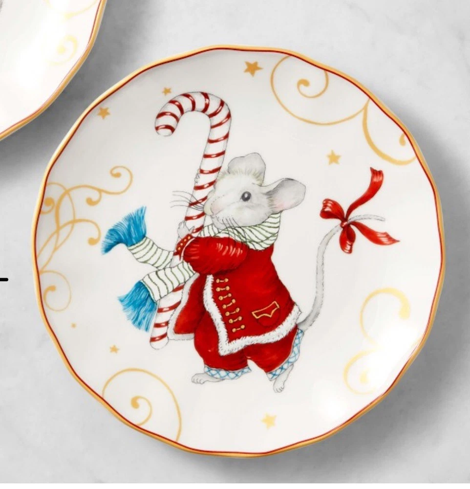 Add a touch of whimsy to your dining table with this set of four Williams-Sonoma salad plates. Featuring a charming mouse design inspired by the classic Christmas tune "Twas the Night Before," these plates are perfect for any holiday occasion or for everyday use. Made of durable porcelain, they measure 8.25 inches in diameter and are sure to delight both kids and adults alike. The multicolor design and country style make them a decorative addition to any kitchen or dining room. Whether you're hosting a dinner party or just enjoying a simple meal with your family, these plates are sure to bring a smile to everyone's face.