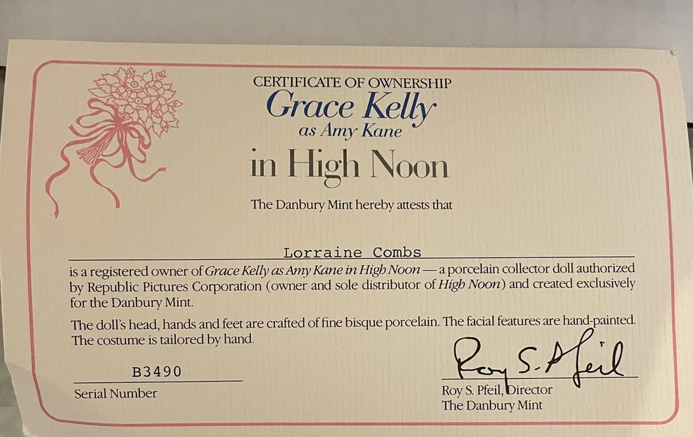 eBay Listing Title: Grace Kelly as Amy Kane in High Noon Danbury Mint Porcelain Doll - Collector’s Edition Description: This stunning Danbury Mint collectible features Grace Kelly as Amy Kane from the classic film “High Noon.” The doll is crafted with fine bisque porcelain, with hand-painted facial features and a meticulously tailored hand-sewn costume. This item includes: • The original box and packaging • Certificate of Ownership (Serial Number B3490) The doll has never been displayed and remains in pristine condition. It’s a must-have for any Grace Kelly or “High Noon” fan, as well as collectors of Danbury Mint porcelain dolls. I ship within 24 hours, excluding weekends and holidays, and offer combined shipping for multiple items. Check out my shop, VintageWowzers, for more curated treasures, and follow me for daily updates on new listings! Thank you for shopping with me—have a wonderful day! Keywords: Grace Kelly doll, Amy Kane, High Noon collectible, Danbury Mint, porcelain doll, vintage collectible, film memorabilia, classic Hollywood, Grace Kelly memorabilia, Danbury Mint dolls