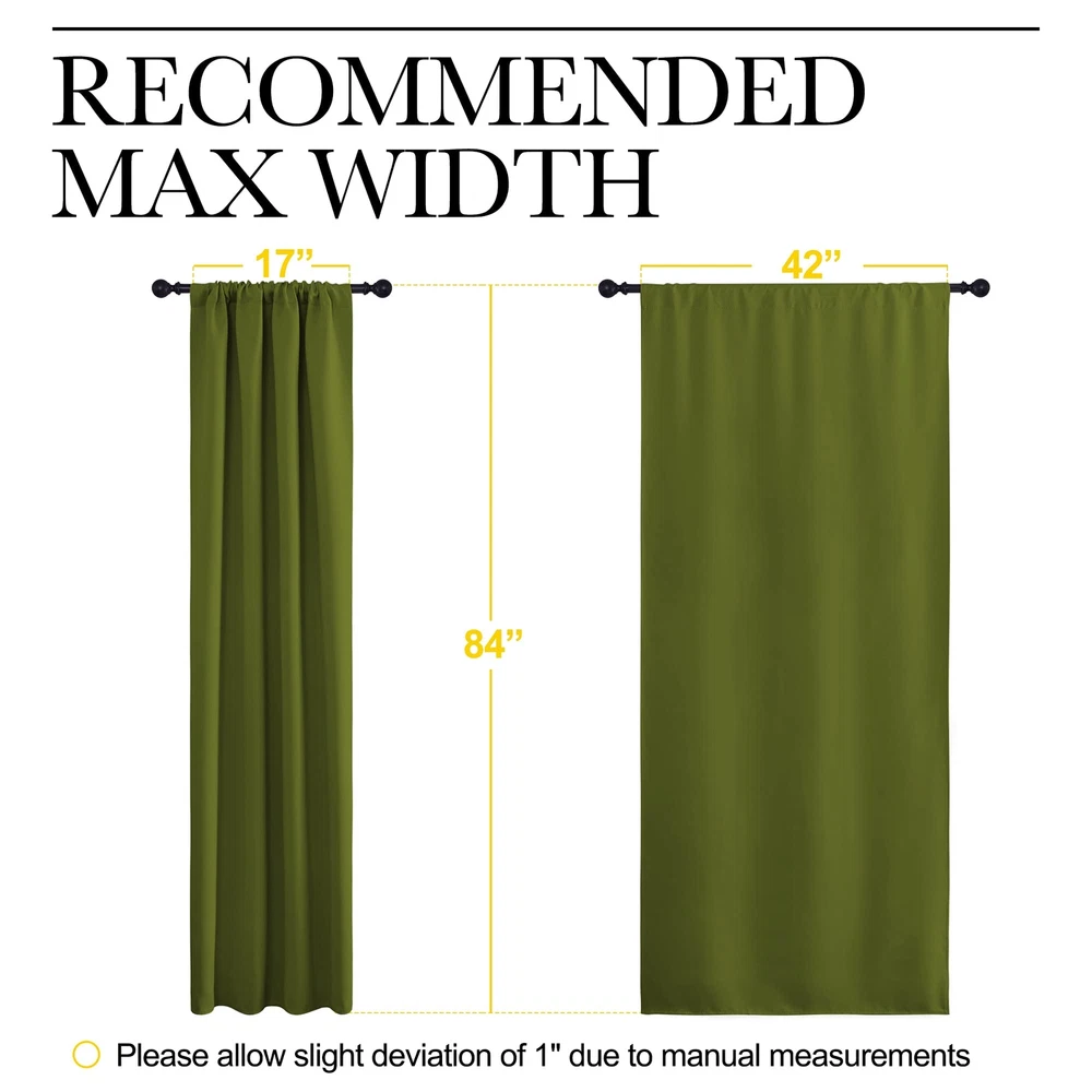 ELEGANT DESIGN: 2 panels per package. Each Blackout Curtain Panel measures 42 inches wide x 84 inches long. Super heavy and soft Blackout Curtain Panels can block 85%-99% light and UV rays. Thread trimmed and wrinkle-free, both sides are the same color. UNIQUE DESIGN: Hang the curtains on a curtain rod through the rod pocket or with rings and hooks. 2" opening top pocket creates pleats easily. As a general rule, for proper fullness panels should measure 2-3 times the width of your window. MULTIFUNCTIONS: Protect your furniture and floor exposed to the sun, while still helping you balance tempurature on heating and cooling your home. Privacy protection. The greatest benefit is to bring you a good night's sleep, making you full of energy every day. GOOD CHOICE: Perfect drapery option for anyone seeking to block daylight, take a nap, or keep sun glare off your TV. Besides, you can choose blackout valance and sheer curtains in the NICETOWN store to match. Such curtain sets provide a more permanent harmonious window dressing. EASY MAINTENANCE: Machine or hand washable. Mild detergent no bleaching. Low-temperature ironing. Measure your pole and window size before you choosing curtains.