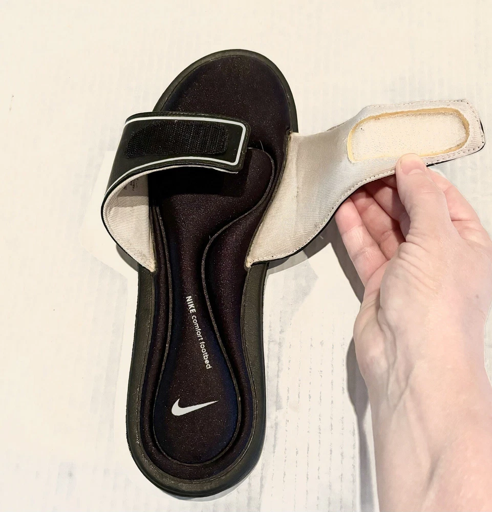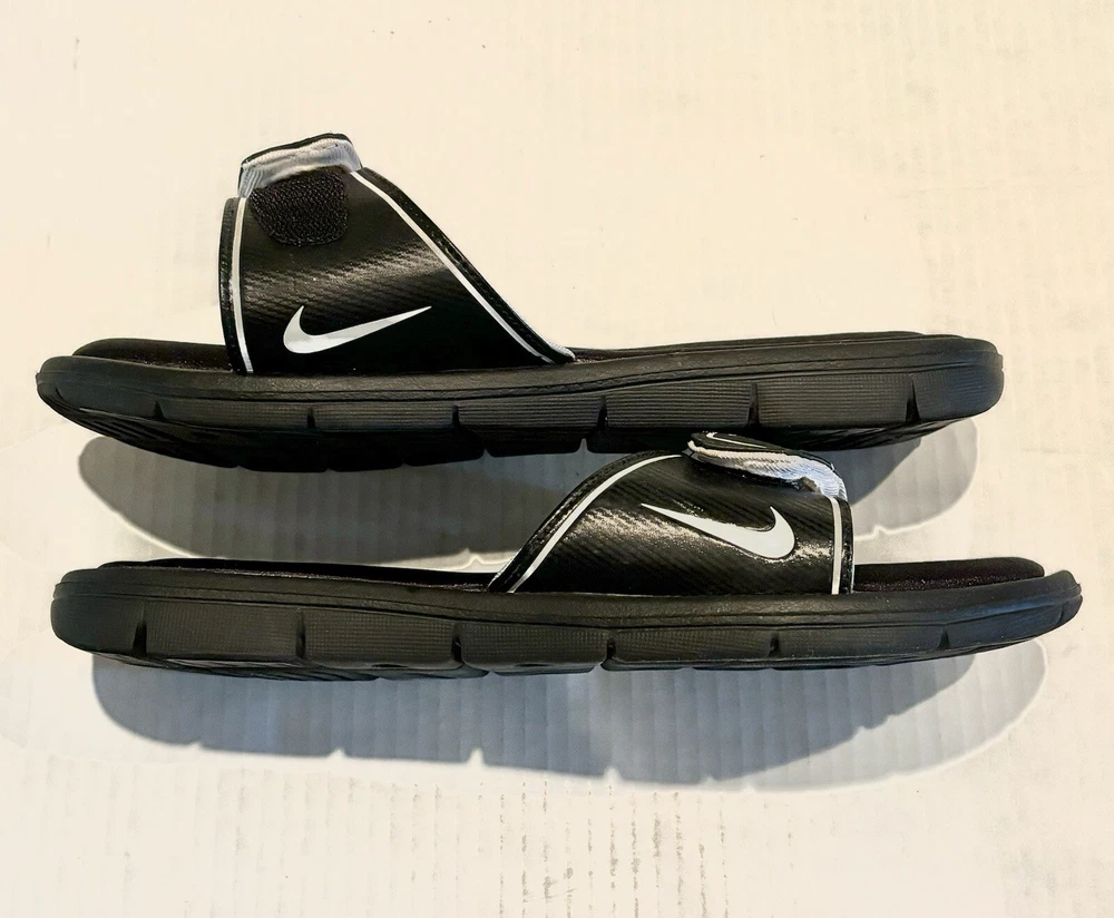 Elevate your casual look with these Nike Comfort Slide Footbed Sandals. These stylish flip flops have a super cushioned sole, come in size 11 and are perfect for any casual occasion. The solid black color and hook & loop closure make them easy to slip on and off. The cushioned and slip-resistant features along with the adjustable top strap ensure maximum comfort. The synthetic upper material adds to the durability. These sandals are a part of the Nike Comfort Slide product line, making them the perfect choice for those who want both style and comfort.