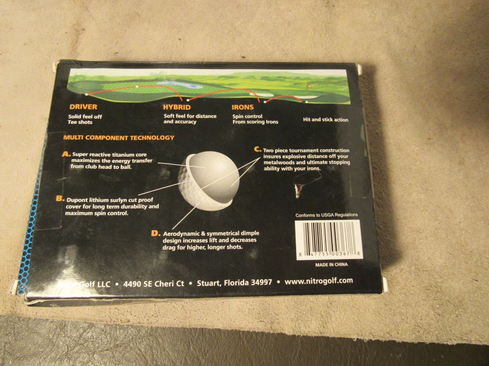 Ball Type:casual or tournamentNumber in Pack:12Features:DistanceModel:NITRO ULTIMATE DISTANCEgtin13:847755003678Brand:NitroMPN:NUD12BXWColor:WhiteCountry/Region of Manufacture:ChinaNumber of Items in Set:12Sport/Activity:GolfUPC:847755003678