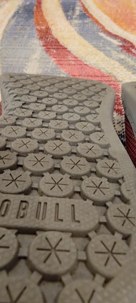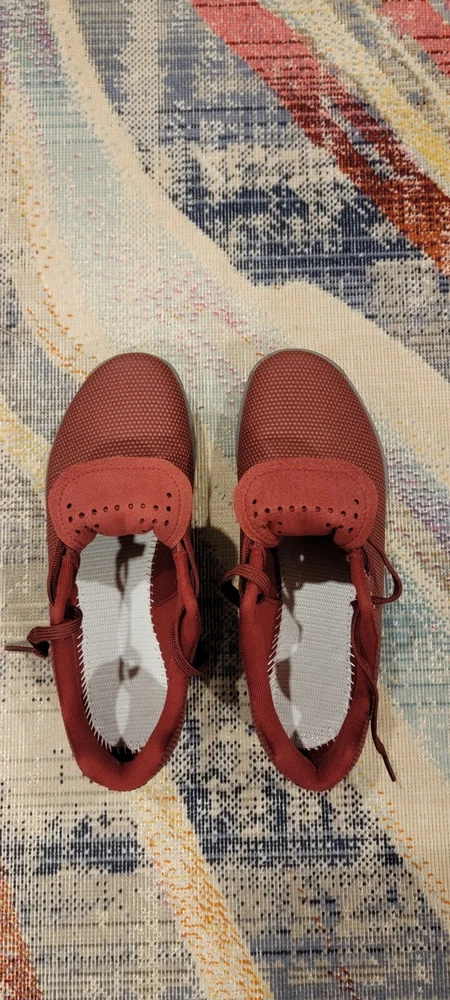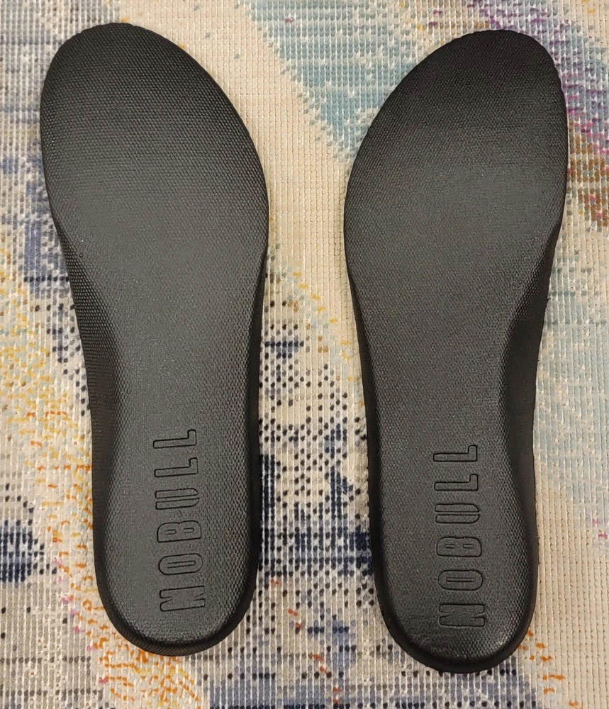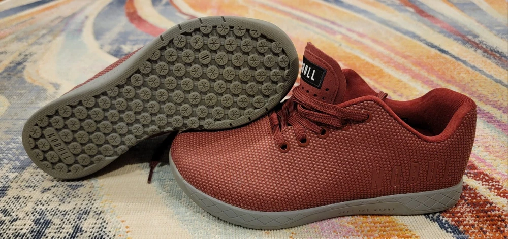 Like-new pair of red womens size 8.5 U.S. NOBULL cross trainer shoes. Rubber soles, upper made of 'Superfabric(c)' with suede trim. Standard red laces. "NOBULL" logo on sides are also in red, logo is black & white on the tongue. Soles are marked with "JUST THE HORNS" on the exterior side of each shoe. Bottom of soles have *(asterisk) pattern. Removable insoles. Like-new condition. No damages, worn parts, tears or staining. Excepting the left shoe has its insole logo slightly worn. See photos.
