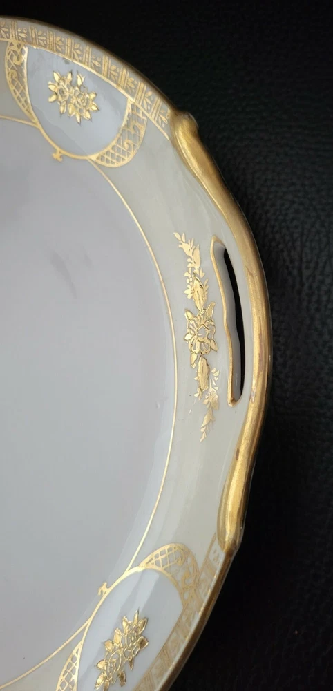 Noritake Cake plate is white with gold accents, gold trim and handles. Measures 9 3/4" in diameter. Circa 1920's Check out my other items, I combine shipping! Payment Payment is requested within 3 days. If no contact or payment is made within 3 days, a dispute will be filed and the item relisted. Shipping Your item(s) will be shipped within 1 business day of payment received. Delivery confirmation is included on packages shipped to a US destination. Insurance is included. For a quote, add items to the shopping cart. International Shipping All duties or tariffs, if any, are the responsibility of the buyer and seller does not have any control over these charges or delays due to custom's inspections. Returns Please contact me if you have any problems. Buyer to pay return shipping unless the item is not as described.