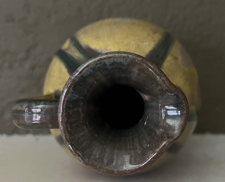 Pitchers with this traditional shape - usually called "Rebekah Jugs" - came in many sizes and have been hand-thrown and hand-glazed by North Carolina potters for decades. It has a multi-colored gloss drip glaze that flows beautifully all over the exterior & interior. It is about 6-1/2 inches tall and 3-3/4 inches in diameter at its widest point. The curved handle is about 1-3/4 inches long and extends about 1-3/8 inches from the body of the pitcher. The base is about 2-1/2 inches in diameter and the top rim with spout is about 1-3/4 inches in diameter. Unfortunately, these pitchers are often found without a potter's mark but I would attribute this to a North Carolina maker. Age is unknown but I have had it for years and it is not new. It is in very good condition with no chips, hairlines, or crazing. Ships USPS. Please look at my ebay store for more North Carolina pottery!