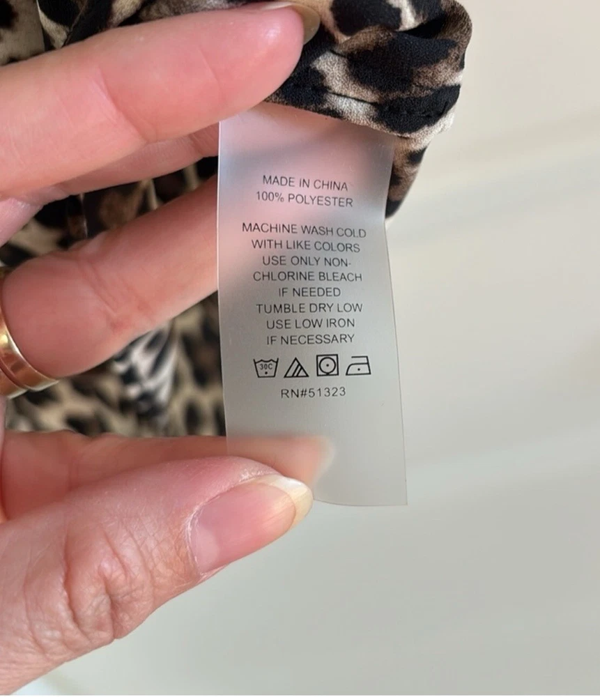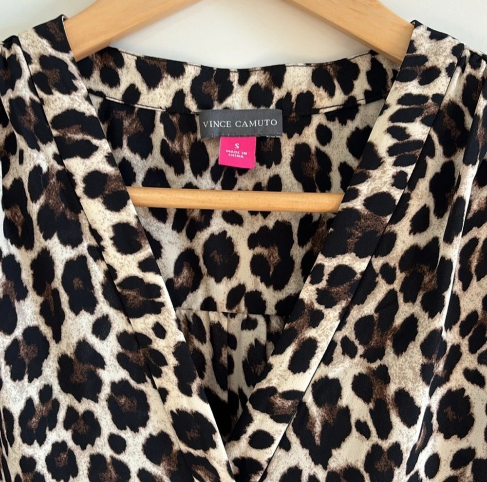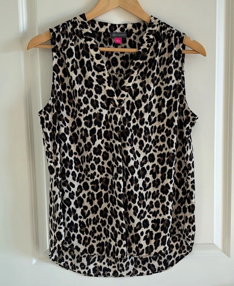 This stylish Vince Camuto blouse is perfect for any occasion. The black animal print, featuring a cheetah character, is eye-catching and unique. The V-neckline and sleeveless design make it lightweight and breathable, ideal for summer, fall, winter, or spring. The pullover closure and regular fit make it easy to wear, while the chiffon fabric type adds a touch of elegance. It's machine washable and made of polyester, ensuring durability. This blouse is perfect for parties, cocktails, casual outings, workwear, or business settings. Available in size S, it's a must-have for any wardrobe. New without tags 100% polyester Smoke free & pet free home