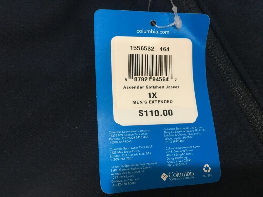 Welcome to my auction for a Brand New w/ Tags Columbia Mens Ascender Softshell Jacket. This awesome top of the line jacket features Soft bonded material for comfort Water-and-wind-resistant fabric sheds moisture and blocks wind by using materials that resist water and drafts, so you stay comfortable in light rain and wind Chin guard prevents chafing Zippered chest pocket and hand pockets secure essentials Adjustable cuffs and a drawcord-adjustable hem seal out the elements 100% polyester The color is navy blue with the Columbia logo on the chest - very cool! This listing is for a size Big & Tall SEXTUPLE EXTRA LARGE 6X / 6XL (P icture may be of different size) . This jacket retails for $110.00. I guarantee the authenticity of all of my items - check my feedback and know that you are purchasing from a trusted source. Winning bidder to add $10.00 for shipping (international add $40). Check my other auctions for more great items available for sale. Thanks for viewing my auction!