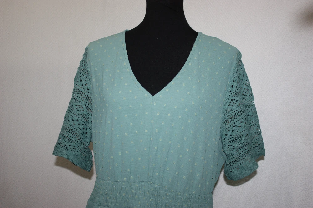 Welcome to Pim's clothing sales Mint green dress with Swiss dot designs. Pullover. Elastic Empire waist. Crochet lace short sleeves and fringed hem. Brand: Bloomchic Material: 100% Polyester body, Cotton and Nylon lace Size: 12 US tagged - see measurements below Shoulders: 17 Bust: 22 armpit to armpit Waist: 16 measured across Length: 49 shoulder to hem (Ask if you need more measurements) Please Remember all Clothing Items may fit differently depending on Brand, Fit, Use or Prior customization. We strongly urge our customers to check measurements first to guarantee proper fitting. Please be sure to check out our listings frequently for more high quality Designer Brand clothing items at a fraction of the price. We are getting new inventory all the time! You never know what amazing deals you may find :) Shipping discounts will be provided for multiple purchases - Please contact us after multiple purchases for an updated invoice.