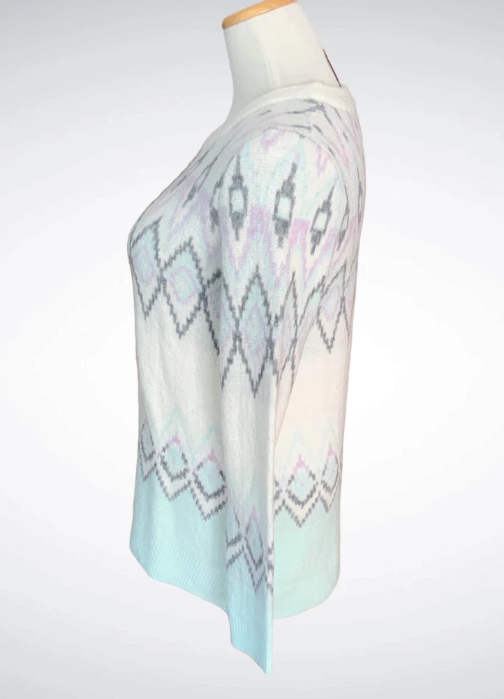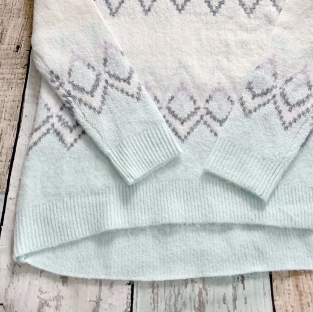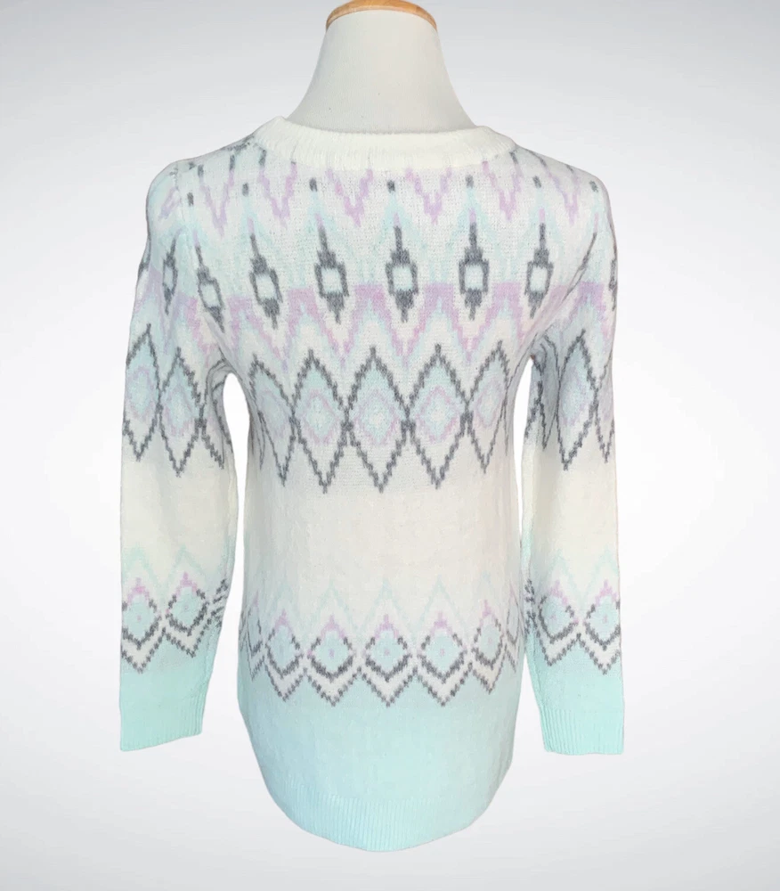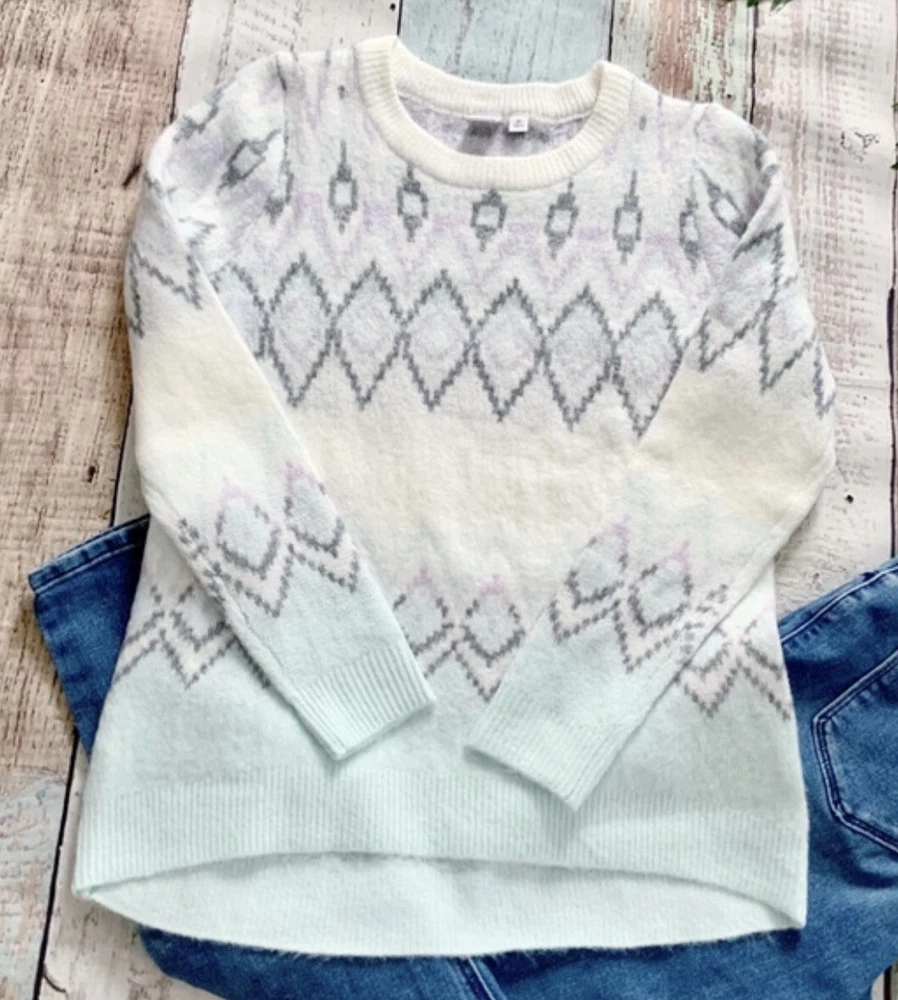 This is a soft pullover sweater from Gap. It’s done in pretty pastel colors with a diamond pattern front and back. It has a rounded neckline, with long sleeves and a curved high/low hem. Size XS, the chest is approx 17” across so it fits more like a Small. The length is about 24” in the front and 26” in the back. Brand new, never worn.