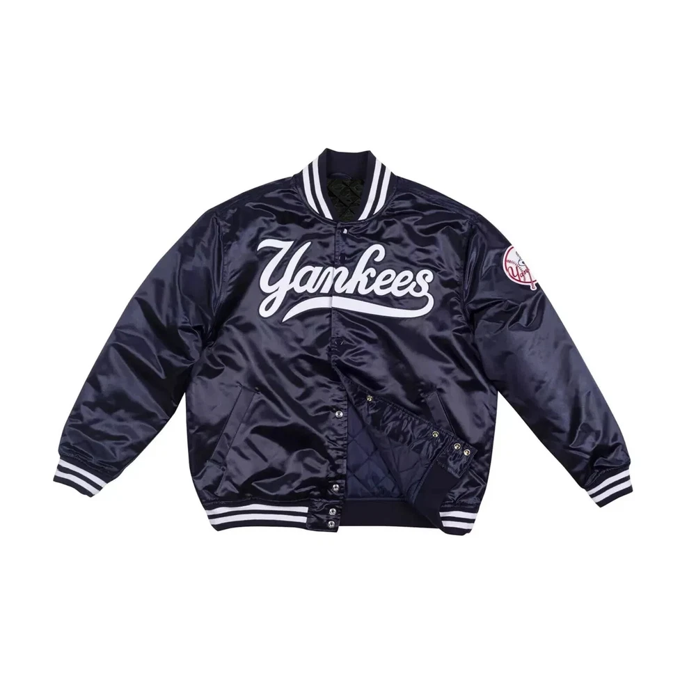 NY Yankees Vintage 90s Athletic Jacket Blue Satin Bomber Style Varsity Jackets Material: 100% Polyester with Satin Finish Jacket Type: Mid-weight suitable for moderate temperatures Inner Lining: 100g Soft Polyester Quilted Collar: Stand-up collar with ribbed trim Cuffs & Waistband: Ribbed for a snug fit Closure: Full snap front for easy fastening Pockets: Two front pockets + one interior pocket for convenience Care Instructions: Machine washable, tumble dry low Additional Features: Locker loop for easy hanging Officially Licensed: No Store Location: Pakistan Perfect for: Moderate weather conditions, offering both comfort and style with an embroidered fabric applique design.