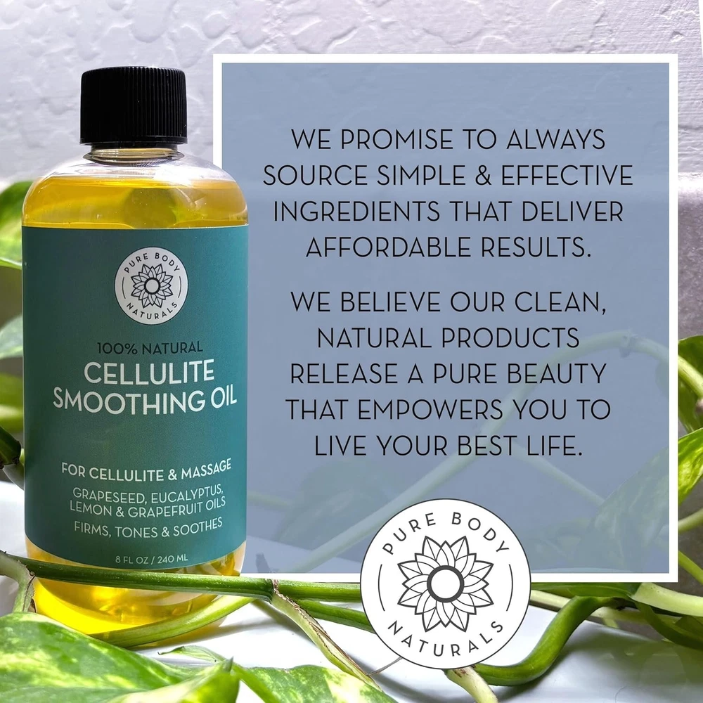 ✅ 8 fl oz bottle of Anti Cellulite Oil for skin firming; Includes pump and dispenser cap ✅ Aides in smoothing, slimming, and tightening saggy skin on the legs, face, thighs, and butt ✅ Anticellulite & tightening oil that effectively reduce and remove cellulite by addressing fat deposits that cause cellulite dimpling ✅ Age-defying body oil hydrates and tighten the skin more deeply than cellulite removal cream or gel ✅ By Pure Body Naturals - Gluten free, Vegan, Hexane Free, Not tested on Animals, Made in the USA