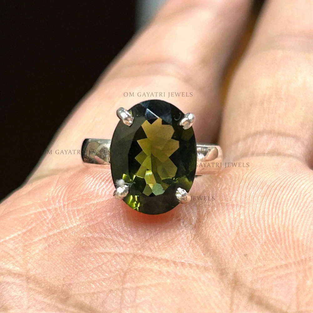 Add a touch of vintage charm to your collection with this beautiful handmade Moldavite ring. The oval-shaped gemstone is set in 925 sterling silver and features a stunning green color that will surely catch anyone's eye. The ring is customizable, making it perfect for engagements, weddings, anniversaries, birthdays, and even Christmas and Valentine's Day gifts. The ring has a bezel setting style and is stackable, making it a great addition to any jewelry collection. The gemstone is natural and has an excellent cut grade, with a clarity grade of eye clean. It has a band width of 2mm and a main stone length of 10mm, with a depth of 2.5mm. This ring is perfect for those who love nature and love themes. Natural Cut Moldavite Ring 925 Sterling Silver Oval Cut Handmade Ring - All Size Gemstone:- Moldavite Stone Size:- 8x10mm Stone Shape:- Oval Stone Category:- Faceted Metal:- 925 Sterling Silver