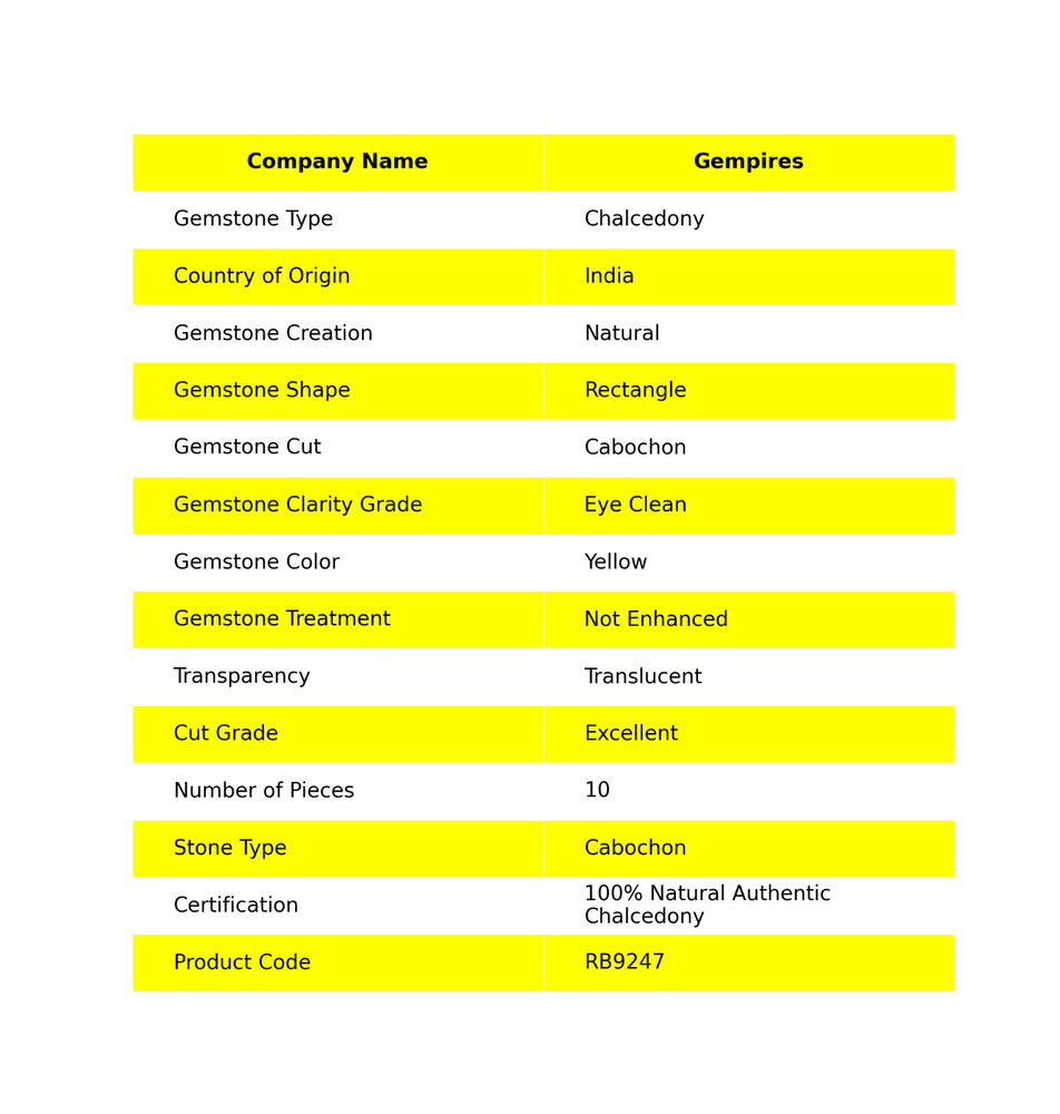 Welcome To Gempires The product is a set of 10 natural, authentic Chalcedony gemstones from India. These translucent gemstones are in a vibrant yellow color, with a rectangular shape and excellent cut grade. They are eye clean and polished, making them ideal for jewelry making. The gemstones are not treated or enhanced, and they come with certification guaranteeing their authenticity. This handmade wholesale set is perfect for creating unique and beautiful pieces of jewelry. Cabochon Indian Chalcedony Top Quality Gemstone Natural 10 Pcs Wholesale Lot Check My Other Chalcedony Listings : Click Here Note: For Custom / Bulk Order, Please contact on Ebay Message Service. QUALITY ASSURANCE:- The photo may not give you the actual size, please refer to the item description for size details. Our product Images are original. We dont use Photoshop for any editing. We always do our best to display an actual image of the gemstone which is to be delivered to our customers. We check all our items and ensure the best quality standards. The item weight may vary 5% (+/-) at maximum and size may vary .10 cents (+/-) as per the gemstone standard. Return Policy:- Any reason, if you are not satisfied with our product, you may return item within 14 days from the date of product delivered. The Item must be returned in its original condition. Return shipping will be paid by buyer. Shipping Policy: At Gempires, we offer two shipping options for our customers: Standard Shipping: 13-15 Days Express Shipping: 5-7 Days Standard Shipping: Our standard shipping option takes approximately 13-15 days for delivery. Please note that this is an estimated time frame and may vary depending on your location and any unforeseen circumstances. We strive to ensure that your order is processed and shipped as quickly as possible. Express Shipping: If you need your order delivered quickly, we offer an express shipping option that takes approximately 5-7 days for delivery. This option is available at an additional cost, which will be displayed during the checkout process. Please note that this time frame is an estimated delivery time and may vary depending on your location and any unforeseen circumstances. Handling Time All orders are processed and shipped within 1-2 business days after payment has been received. Once your order has been shipped, you will receive a tracking number via Ebay notifications, which you can use to track your package. Custom Duty Note Please note that we are not responsible for any customs or import duties that may be charged once the package reaches your country. These charges are the responsibility of the buyer and are not included in our shipping fees. We take great care in packaging our products to ensure that they arrive at your doorstep in pristine condition. However, if your package arrives damaged or you have any other concerns about your order, please don't hesitate to contact us. We will do our best to resolve any issues and ensure that you are satisfied with your purchase. Feedback Policy:- At Gempires, we value your feedback and strive to provide the best customer experience possible. We welcome your reviews and appreciate your time in sharing your thoughts about your purchase with us. If you are satisfied with your purchase and our service, we would love to hear about it. Your positive feedback can help other buyers make an informed decision about our products and services. If for any reason you are not completely satisfied with your purchase or our service, please reach out to us before leaving a negative review. We are committed to resolving any issues that may arise and ensuring your satisfaction. Thank you for choosing Gempires for your natural gemstone needs. Your feedback is valuable to us, and we look forward to providing you with exceptional service in the future. Best Regards Gempires