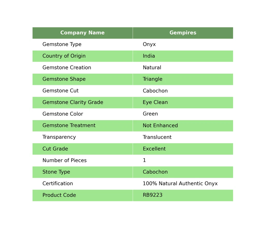 Welcome To Gempires This is a single piece of translucent green Onyx gemstone, in a triangle shape with an excellent cut grade. It is a natural gemstone from India, with a polished form and eye-clean clarity grade. The Onyx gemstone is not treated or enhanced, and comes with certification as 100% natural authentic Onyx. It is handmade and available for wholesale purchase. Natural Indian Onyx Loose Gemstone For Jewelry Making Cabochon Check My Other Onyx Listings : Click Here Note: For Custom / Bulk Order, Please contact on Ebay Message Service. QUALITY ASSURANCE:- The photo may not give you the actual size, please refer to the item description for size details. Our product Images are original. We dont use Photoshop for any editing. We always do our best to display an actual image of the gemstone which is to be delivered to our customers. We check all our items and ensure the best quality standards. The item weight may vary 5% (+/-) at maximum and size may vary .10 cents (+/-) as per the gemstone standard. Return Policy:- Any reason, if you are not satisfied with our product, you may return item within 14 days from the date of product delivered. The Item must be returned in its original condition. Return shipping will be paid by buyer. Shipping Policy: At Gempires, we offer two shipping options for our customers: Standard Shipping: 13-15 Days Express Shipping: 5-7 Days Standard Shipping: Our standard shipping option takes approximately 13-15 days for delivery. Please note that this is an estimated time frame and may vary depending on your location and any unforeseen circumstances. We strive to ensure that your order is processed and shipped as quickly as possible. Express Shipping: If you need your order delivered quickly, we offer an express shipping option that takes approximately 5-7 days for delivery. This option is available at an additional cost, which will be displayed during the checkout process. Please note that this time frame is an estimated delivery time and may vary depending on your location and any unforeseen circumstances. Handling Time All orders are processed and shipped within 1-2 business days after payment has been received. Once your order has been shipped, you will receive a tracking number via Ebay notifications, which you can use to track your package. Custom Duty Note Please note that we are not responsible for any customs or import duties that may be charged once the package reaches your country. These charges are the responsibility of the buyer and are not included in our shipping fees. We take great care in packaging our products to ensure that they arrive at your doorstep in pristine condition. However, if your package arrives damaged or you have any other concerns about your order, please don't hesitate to contact us. We will do our best to resolve any issues and ensure that you are satisfied with your purchase. Feedback Policy:- At Gempires, we value your feedback and strive to provide the best customer experience possible. We welcome your reviews and appreciate your time in sharing your thoughts about your purchase with us. If you are satisfied with your purchase and our service, we would love to hear about it. Your positive feedback can help other buyers make an informed decision about our products and services. If for any reason you are not completely satisfied with your purchase or our service, please reach out to us before leaving a negative review. We are committed to resolving any issues that may arise and ensuring your satisfaction. Thank you for choosing Gempires for your natural gemstone needs. Your feedback is valuable to us, and we look forward to providing you with exceptional service in the future. Best Regards Gempires