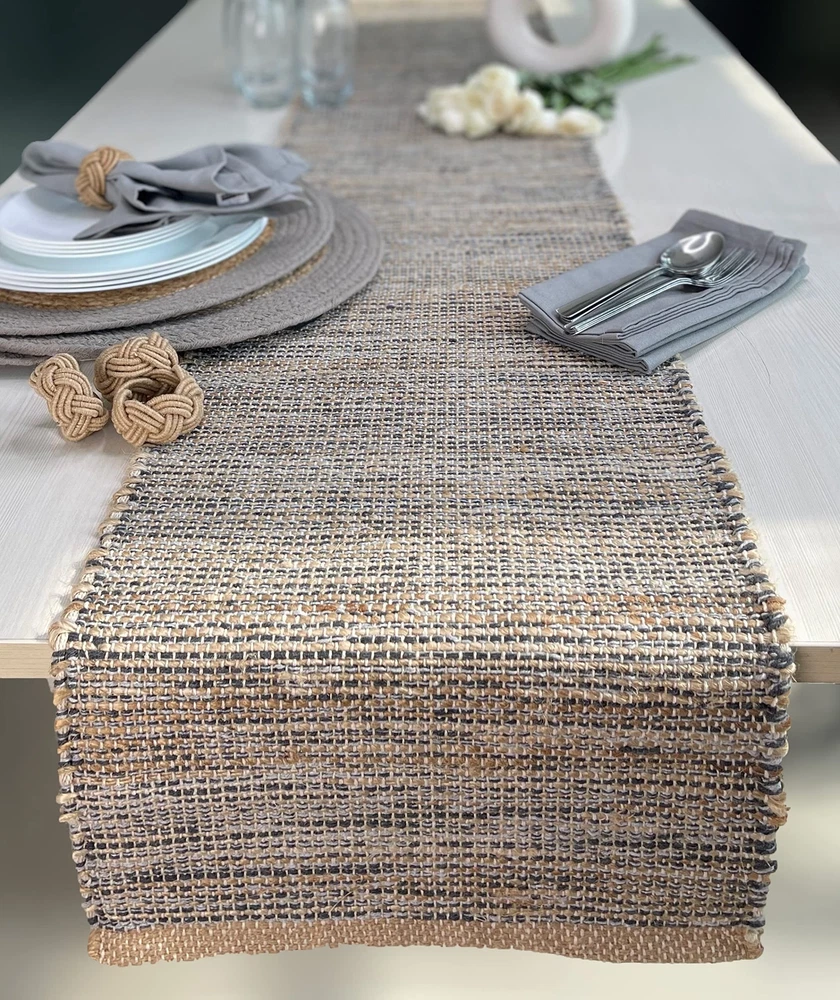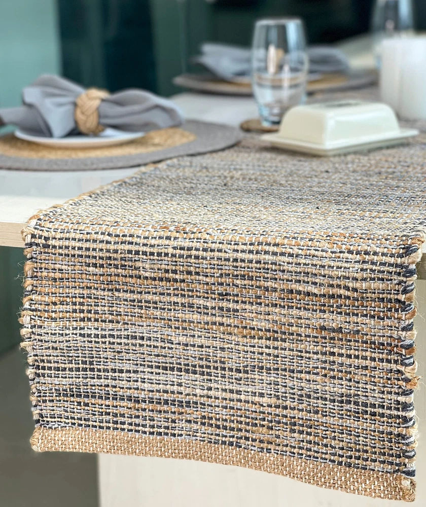 MATERIALS: Our weavers use all natural Jute fibers and intertwine them with recycled cotton yarns to make not only environmentally friendly but also elegant and trendy table runners . Style your tables for any dinner party or occasion with our ultra-chic and luxurious Jute table linen that is also eco-friendly. CONTENTS: Package contains one Jute/ upcycled cotton Table Runner. We also have matching table mats and napkins available HANDCRAFTED: Our weavers ensure that these heavy duty, boho-chic products are also excellent at resisting heat from hot plates and utensils and protect your table from splashes, heat and grime. VERSATILE: You can use these sustainable placemats and runners to cover and protect any surface including but not limited to tables, dressers, consoles, chests, bar, coffee shops, and desks. CARE: Our table products are not only easy to use but also relatively easy to clean. All you have to do is shake briskly and wipe with a damp sponge or cloth. Please do not machine wash- Spot Clean ONLY.