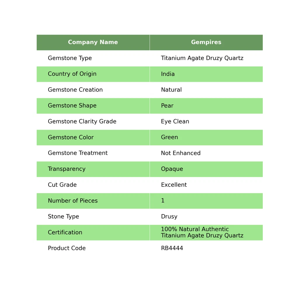 Welcome To Gempires This handmade pear-shaped Titanium Agate Druzy Quartz gemstone from India is a unique and rare find. With excellent cut grade and eye-clean clarity, this 100% natural gemstone showcases a beautiful green color and a drusy form. It is a single piece that has not been treated or enhanced, making it a stunning addition to any jewelry collection. Perfect for those seeking a wholesale purchase of authentic and transparent gemstones. Natural Titanium Agate Druzy Quartz Designer Gemstone Earrings Supply Pear Drusy Check My Other Titanium Agate Druzy Quartz Listings : Click Here Note: For Custom / Bulk Order, Please contact on Ebay Message Service. QUALITY ASSURANCE:- The photo may not give you the actual size, please refer to the item description for size details. Our product Images are original. We dont use Photoshop for any editing. We always do our best to display an actual image of the gemstone which is to be delivered to our customers. We check all our items and ensure the best quality standards. The item weight may vary 5% (+/-) at maximum and size may vary .10 cents (+/-) as per the gemstone standard. Return Policy:- Any reason, if you are not satisfied with our product, you may return item within 14 days from the date of product delivered. The Item must be returned in its original condition. Return shipping will be paid by buyer. Shipping Policy: At Gempires, we offer two shipping options for our customers: Standard Shipping: 13-15 Days Express Shipping: 5-7 Days Standard Shipping: Our standard shipping option takes approximately 13-15 days for delivery. Please note that this is an estimated time frame and may vary depending on your location and any unforeseen circumstances. We strive to ensure that your order is processed and shipped as quickly as possible. Express Shipping: If you need your order delivered quickly, we offer an express shipping option that takes approximately 5-7 days for delivery. This option is available at an additional cost, which will be displayed during the checkout process. Please note that this time frame is an estimated delivery time and may vary depending on your location and any unforeseen circumstances. Handling Time All orders are processed and shipped within 1-2 business days after payment has been received. Once your order has been shipped, you will receive a tracking number via Ebay notifications, which you can use to track your package. Custom Duty Note Please note that we are not responsible for any customs or import duties that may be charged once the package reaches your country. These charges are the responsibility of the buyer and are not included in our shipping fees. We take great care in packaging our products to ensure that they arrive at your doorstep in pristine condition. However, if your package arrives damaged or you have any other concerns about your order, please don't hesitate to contact us. We will do our best to resolve any issues and ensure that you are satisfied with your purchase. Feedback Policy:- At Gempires, we value your feedback and strive to provide the best customer experience possible. We welcome your reviews and appreciate your time in sharing your thoughts about your purchase with us. If you are satisfied with your purchase and our service, we would love to hear about it. Your positive feedback can help other buyers make an informed decision about our products and services. If for any reason you are not completely satisfied with your purchase or our service, please reach out to us before leaving a negative review. We are committed to resolving any issues that may arise and ensuring your satisfaction. Thank you for choosing Gempires for your natural gemstone needs. Your feedback is valuable to us, and we look forward to providing you with exceptional service in the future. Best Regards Gempires