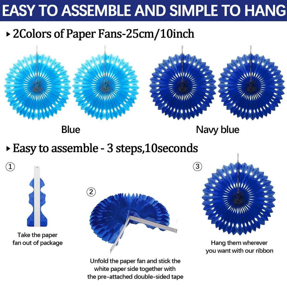Navy Blue Party Decoration,23Pcs Hanging Paper Fans,Pom Poms Flowers,Garland String Polka Dot and Triangle Bunting Flag Packs for Boy Birthday, Bridal Shower,Baby Boy Showers,Wedding Perfect Suitable for winter theme birthday party, boy baby shower garland decoration, party photo props, nursery christening, anniversary celebration decorations, wedding party or any events you want. All of our party supplies have been carefully handmade and crafted, so you can be sure to make your party stand out! Package included: 6 pcs Paper Fans 4 pcs Paper hollow fans 4 pcs Honeycomb Balls 4 pcs paper pom poms 2 pcs Dots Garlands 1 pcs Pennant Banner 2 rolls of ribbons Notes :Due to computer resolution, sunlight, indoor lighting and other factors,there might be a little color difference. Please feel free to contact us, if there is any problem with our product. We are more than happy to assist you to solve it. Thank you. What are you waiting for? Add to Cart now! PARTY DECORATIONS: Our blue party pack decoration for birthday parties is created with the mission to leave everyone with beautiful memories! We can only imagine how amazing set of 23 pcs decoration items can help you light up the beautiful night and make this an unforgettable moment for your kids, yourself, your family, and your friends. 23PCS : You'll get 6pcs Paper Fans, 4pcs Paper hollow fans, 4pcs Honeycomb Balls, 4pcs paper pom poms, 2pcs Dots Garlands, 1pcs Pennant Banner and 2 rolls of ribbon, 23Pcs in total. Help you effortlessly create a beautifully unique party for your occasion. WIDELY USED: Suit for many different themed baby shower, birthday party, birthday photo prop and any events you want. Thrill your guests wherever the celebration occurs! They are suitable for hanging over the fireplace or living room,bar,office,shop,creating a festive atmosphere in the air and bringing happiness around everyhwhere. GREAT COLOR COMBINATION: Suitable for birthday party, boy baby shower garland decoration, party photo props, nursery christening, anniversary celebration decorations, wedding party and etc. EASY to ASSEMBLE: Pom poms need you to spend a few minutes peeling apart and letting them become fluffy, then unfold and slot the lanterns and honeycomb balls into place, unroll garlands gently to avoid tangling, finally hang them to decorate your party. Moreover, they are reusable, just folding them for store if you want to reuse them. Shipping from the USA All of our products are shipped from the USA, ensuring quick delivery to your destination. Payment We offer the following payment methods: PayPal, credit card, bank transfer, and eBay's secure payment system. Free Shipping & Free Returns Shipping within the USA is FREE. Additionally, any return is absolutely free for you. Risk-Free Purchase You have the option to return an item within 30 days without any justification. We cover the return shipping costs! Fast Shipping We ship immediately upon receipt of payment. Generally, the package is delivered within 2-3 days in the USA. If it takes longer, we will contact you. Quality and Costs Made in Europe, USA, China No customs fees or additional charges Total satisfaction guarantee Invoice with declared VAT available upon request in .pdf format Feedback Your feedback is very important to us. After you pay for your purchase, you will automatically receive positive feedback from us.