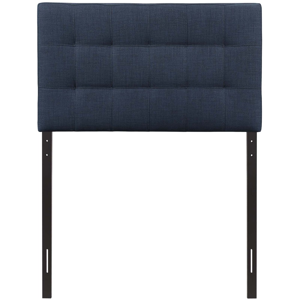 Lily Twin Upholstered Fabric Headboard - Navy Add elegance to your bedroom with the Lily tufted headboard. Designed with just the right amount of grace Lily is made from fiberboard plywood and fine polyester upholstery for a construction that is both lightweight and long lasting. Perfect for contemporary and modern bedrooms sleep soundly with a piece that imparts a sense of tranquility amidst an impressive backdrop of style.Set IncludesOne Lily Twin Headboard Elegantly tufted headboard Fits twin size beds Deep tufting with stylish trim Fine polyester upholstering Fiberboard and plywood frame Twin Wood Post distance 36 inches Overall Product Dimensions 3.5"L x 39"W x 45 52.5"H Bedframe Mounting Location 4.5 8.5"H Mounting Location A Height to Top of Headboard 52.5"H Mounting Location A Height to Bottom of Headboard 30.5"H Mounting Location B Height to Top of Headboard 50"H Mounting Location B Height to Bottom of Headboard 28"H Mounting Location C Height to Top of Headboard 47.5"H Mounting Location C Height to Bottom of Headboard 25.5"H Mounting Location D Height to Top of Headboard 45"H Mounting Location D Height to Bottom of Headboard 23"H Product Materials Frame MDF LVL Plywood Fabric Material 100 Polyester