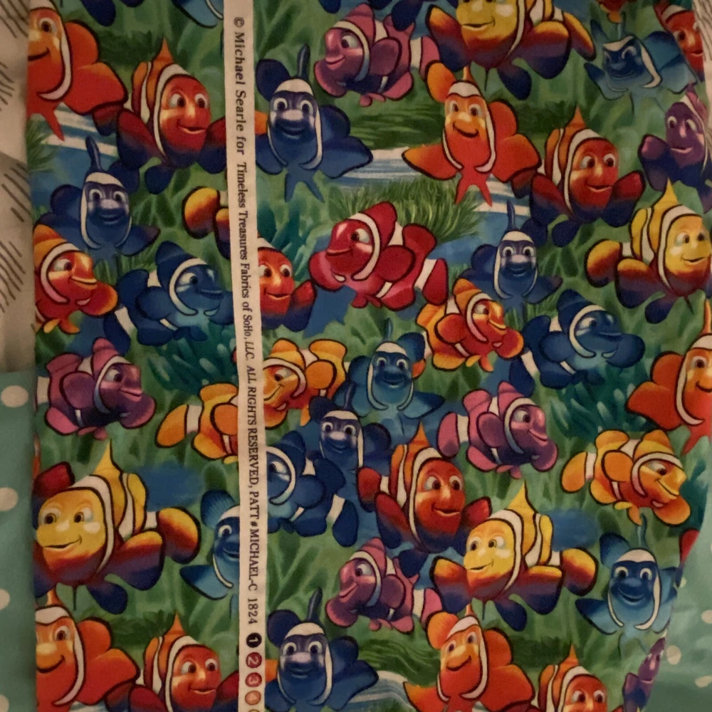 This Nemo Cotton Fabric by Timeless Treasures is perfect for all your crafting needs. The fabric is made of high-quality cotton material and comes in a beautiful multicolor pattern of Nemo and Dory Fish. It is suitable for sewing, quilting, and crafts, and has a length of 1 yard plus 22 inches with a tail x 33” width with one selvage intact. The fabric is designed by Michael Searle for Timeless Treasures. Comes from pet and smoke free home. Fabric has been recently laundered.