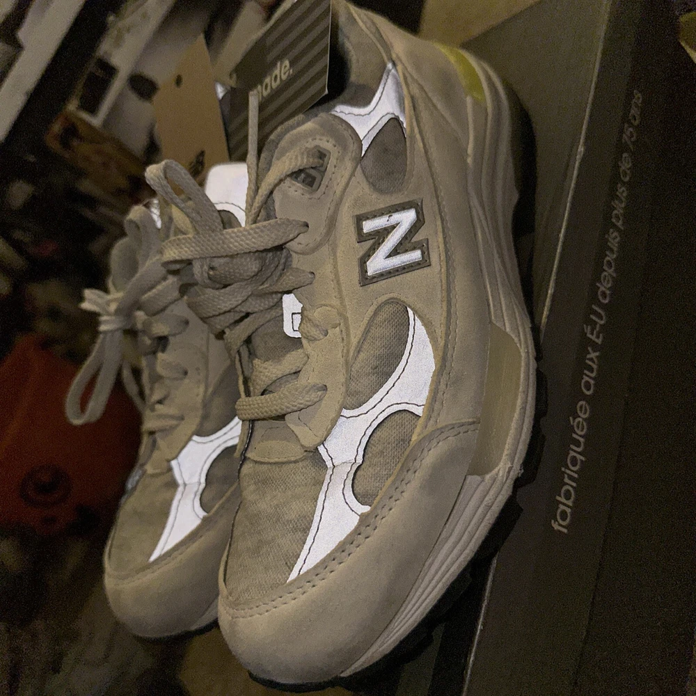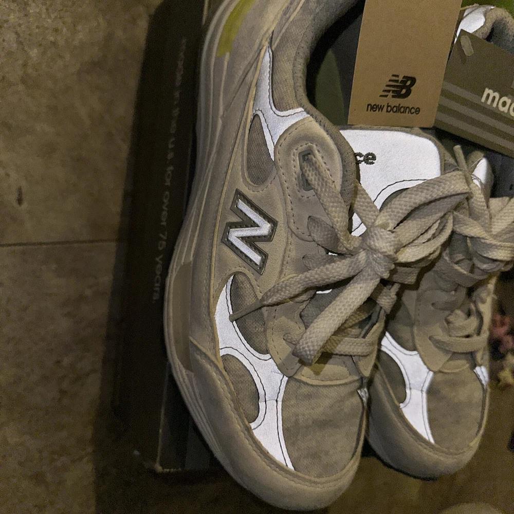 Elevate your active and casual wear with these stylish New Balance 992 sneakers. Made in the USA with a gray suede upper and white cyclone design, these limited edition shoes are both comfortable and lightweight. The lace-up closure ensures a secure fit while the rubber outsole provides traction for walking, running, and jogging. These women's sneakers feature a cushioned insole, no pronation, and a low-top shoe shaft style. The synthetic lining material and foam insole material further add to the comfort. With a solid pattern and New Balance logo accents, these shoes are the perfect addition to any sneaker collection.