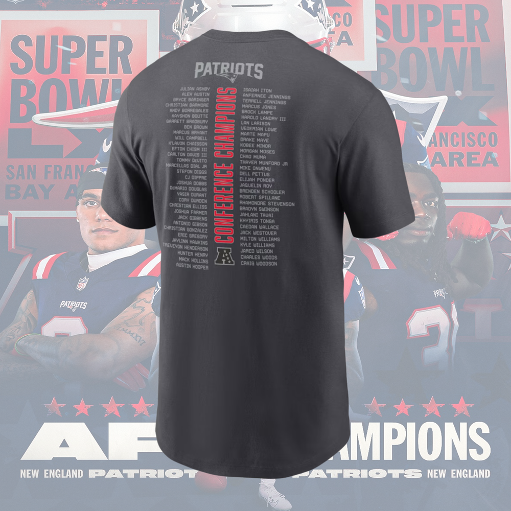 New England Patriots 2025 AFC Champions Roster T-Shirt Description: Step up your gifting game with our Gildan cotton t-shirts, and for yourself, available for both custom and pre-designed prints. Crafted with the soft, breathable comfort of 100% cotton, these T-shirts are not just a piece of clothing but a canvas for expression. Utilizing the latest in DTG (Direct to Garment) printing technology, we offer you the ability to capture vivid, durable designs that withstand up to 300 washes. Whether it's a personalized gift for a birthday, an anniversary, or a special event, or you're choosing from our diverse range of ready-made designs, our t-shirts are guaranteed to impress. Key Features: • Superior Quality Material: Enjoy the lightweight, airy comfort of premium Gildan cotton, ensuring a pleasant feel against the skin throughout the day. • Advanced DTG Printing: Experience the difference with our cutting-edge DTG printing technology, ensuring your designs are crystal clear, vibrant, and durable for up to 300 wash cycles. • Wide Selection of Designs: Whether customizing a unique piece or selecting from our extensive collection of pre-designed t-shirts, you're bound to find the perfect match for any personality or occasion. • Ideal for Gifting: Looking for a thoughtful, personalized gift? Our t-shirts are perfect for making occasions extra special. Customize with a memorable message, a favorite graphic, or choose a design that speaks to their interests and passions. • Fit and Sizes for Everyone: Our range includes sizes from small to extra-large, catering to a wide audience. The unisex fit makes it a comfortable choice for anyone, ensuring you find the perfect gift for friends, family, or yourself. • Durability & Care: Made to last, these t-shirts retain their shape, color, and the vibrancy of prints, proving to be a long-lasting addition to any wardrobe. How to Make It Yours: Design Selection: Choose a pre-designed t-shirt or upload your design for a personalized touch. Size It Right: Pick from our variety of sizes. Consult our size chart to ensure the perfect fit. Place Your Order: Once your choice is made, leave the rest to us. We'll ensure your t-shirt is printed with precision and care, ready to make someone's day special. Why Choose Our Gildan Cotton T-Shirts? • Unmatched print quality and durability • A vast array of design options • Comfortable and versatile fit for all • The perfect personalized gift for any occasion • Fast and reliable shipping Gift something unique, thoughtful, and wearable. Whether celebrating a moment, sharing a joke, or keeping a memory alive, our Gildan cotton t-shirts are your go-to choice for gifts that are both personal and practical. Order now and let your gift speak volumes!