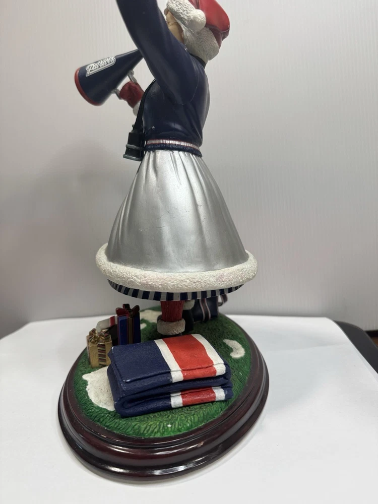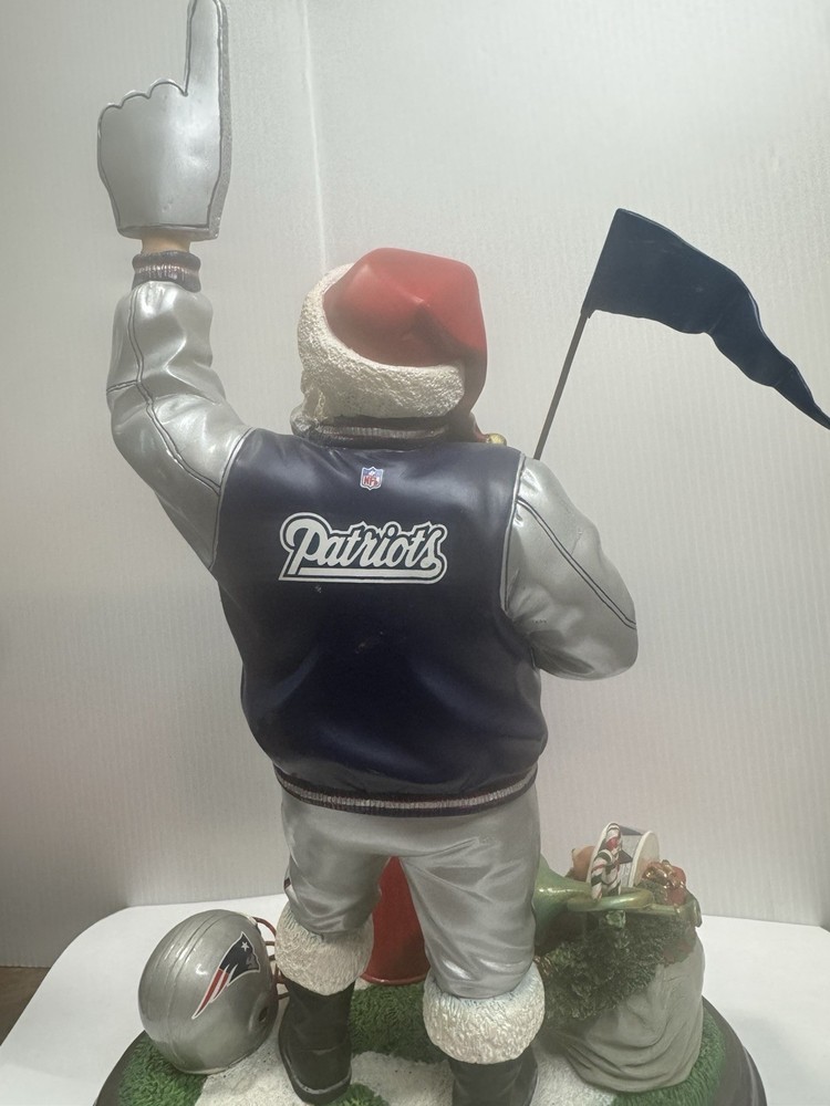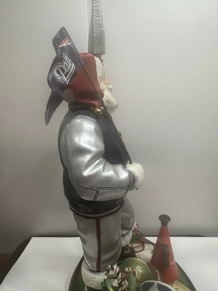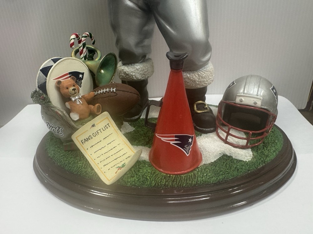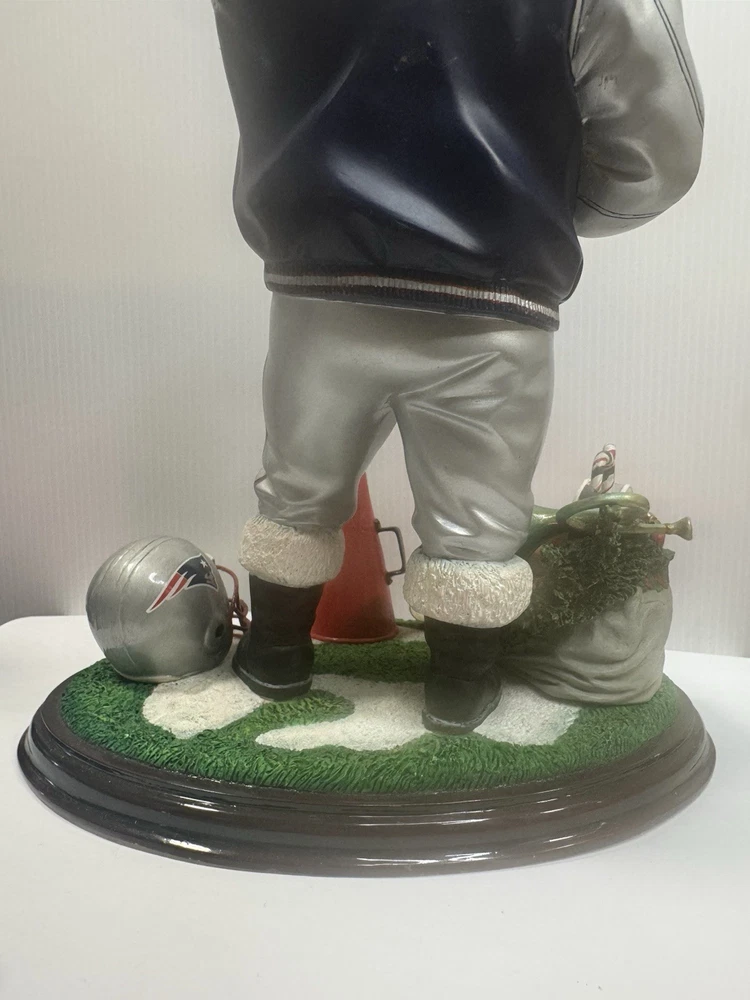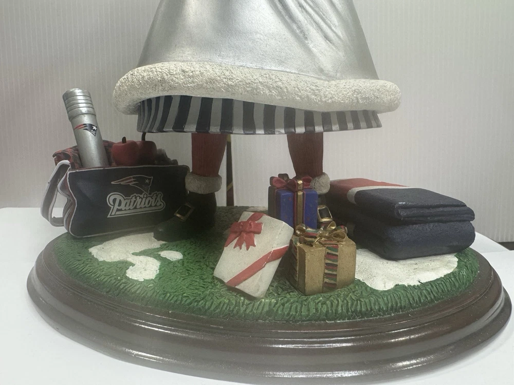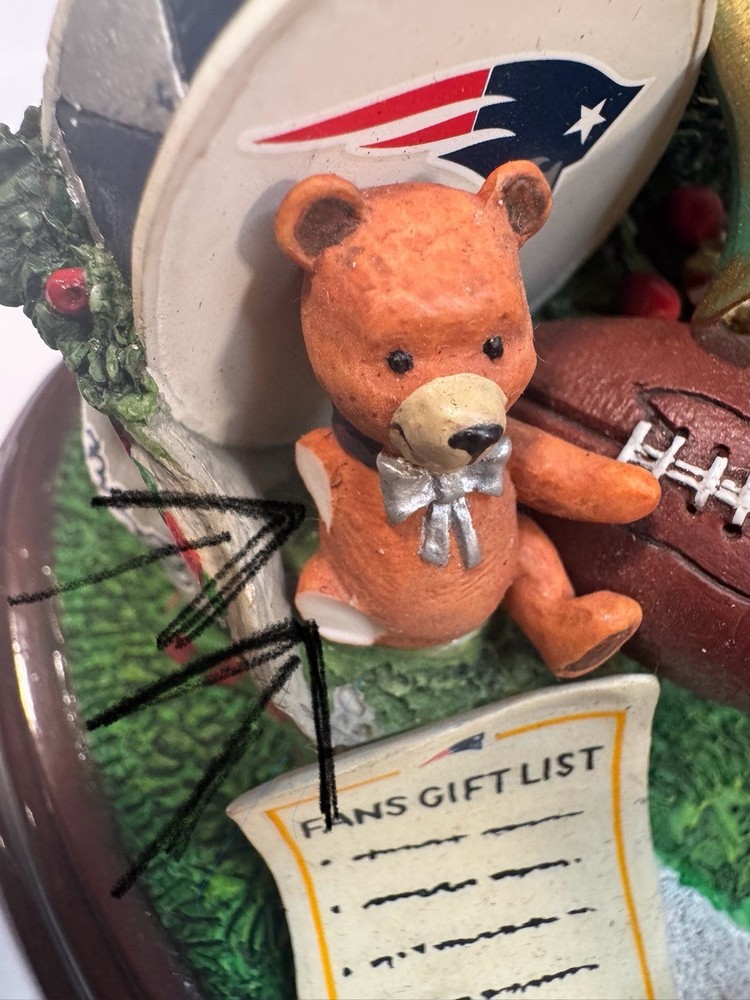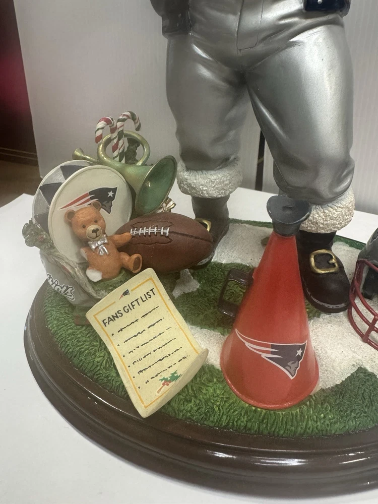 Capture the holiday spirit with this unique New England Patriots Santa Claus and Mrs. Claus collectible from Danbury Mint, commemorating the 2000/2001 NFL season. Immerse yourself in the festive cheer of the Patriots' fandom with this intricately designed piece that's a must-have for any dedicated football enthusiast or collector. Adorned with the iconic colors and logo of the New England Patriots, this set is a tribute to one of the NFL's most successful teams. Perfect for display during the holidays or as part of your sports memorabilia collection, it's a charming representation of team spirit that celebrates the legacy of the New England Patriots. Lil bear on santa Claus with arm and leg broken