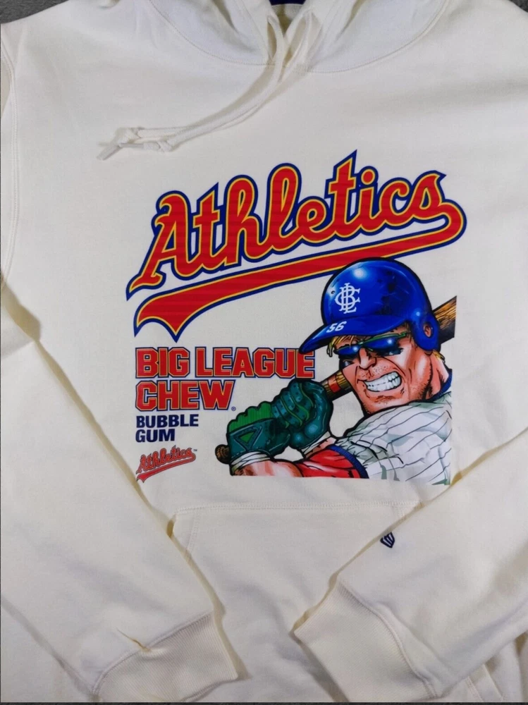Embrace your team spirit with the New Era X Big League Chew Oakland Athletics Cream Hoodie. Designed for the dedicated fan, this ivory hoodie features high-quality fabric and a comfortable fit, perfect for cheering from the stands or representing your team on the go. This regular-season essential is not only officially licensed by the MLB but also boasts a size large that fits most fans comfortably. Show your support for the Oakland Athletics with this stylish and comfortable piece of fan apparel.