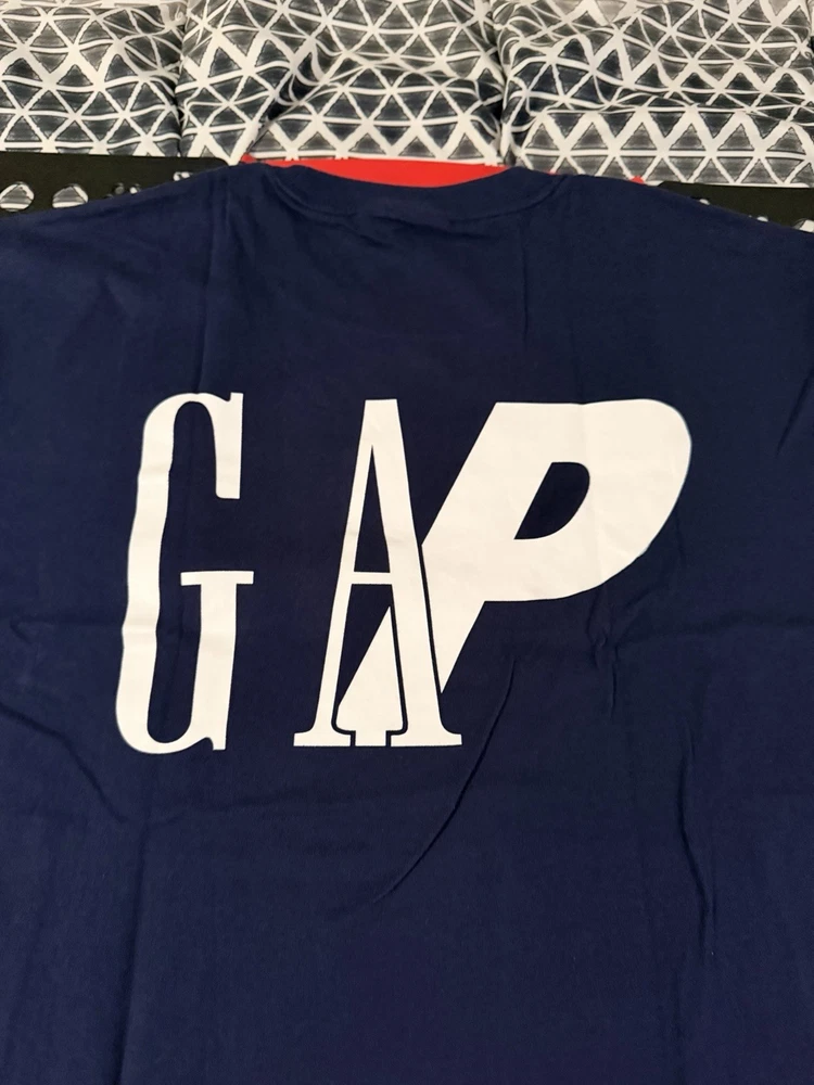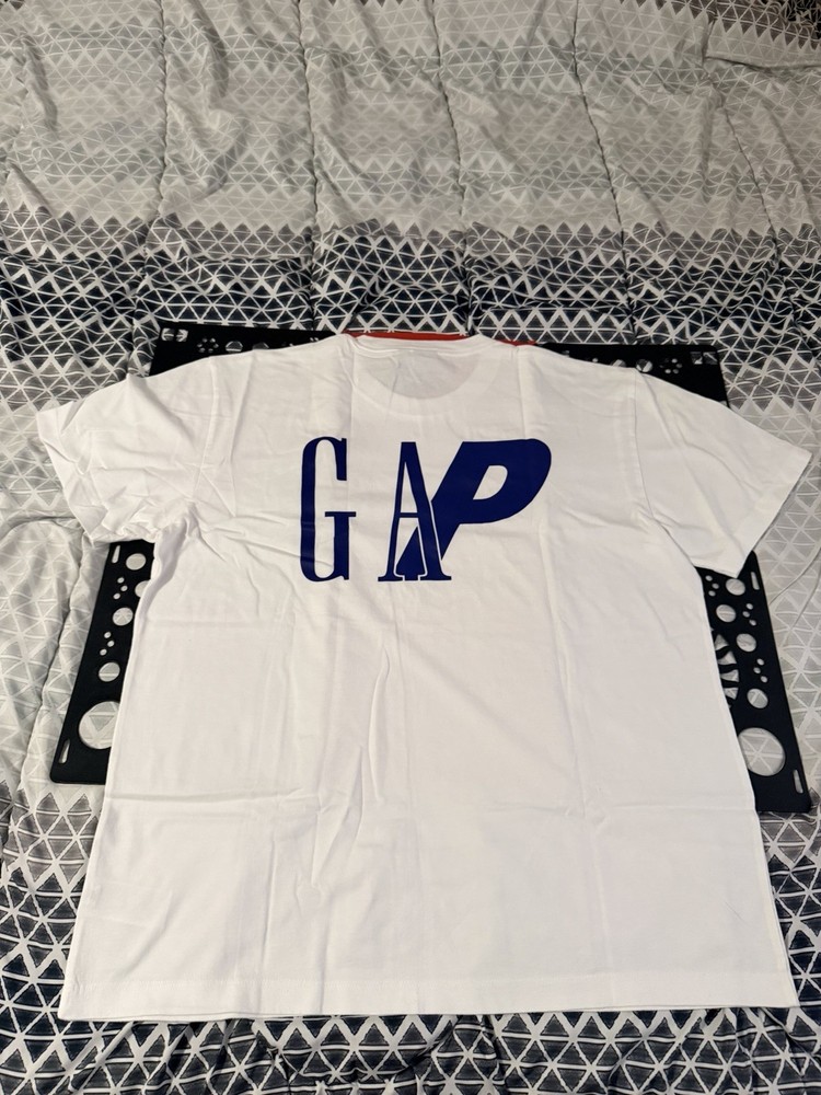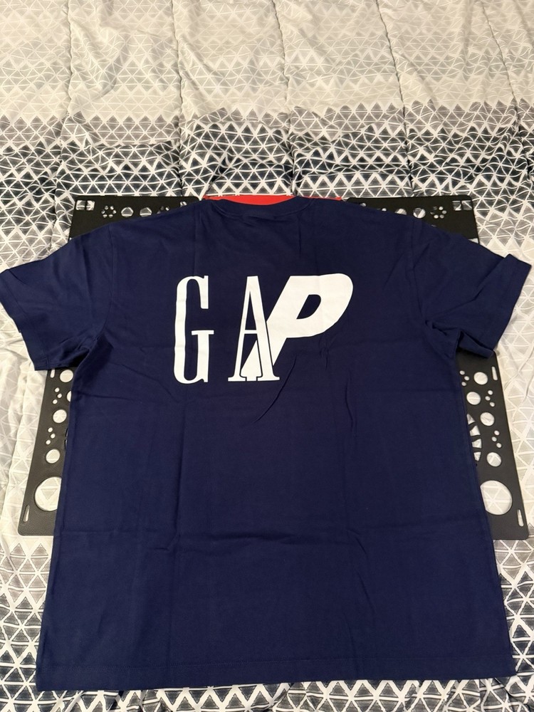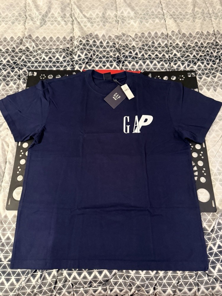 The product is a set of two Gap T-shirts in white and navy, both in size large. These short-sleeve shirts are made of cotton jersey fabric, featuring a crew neckline and a regular fit. With a logo accent on the front, these machine washable shirts are perfect for the seasons of summer, fall, and spring. Made by the brand Gap, these solid-colored T-shirts are a versatile addition to any man's wardrobe, offering both style and comfort. You are buying both t-shirts both size large