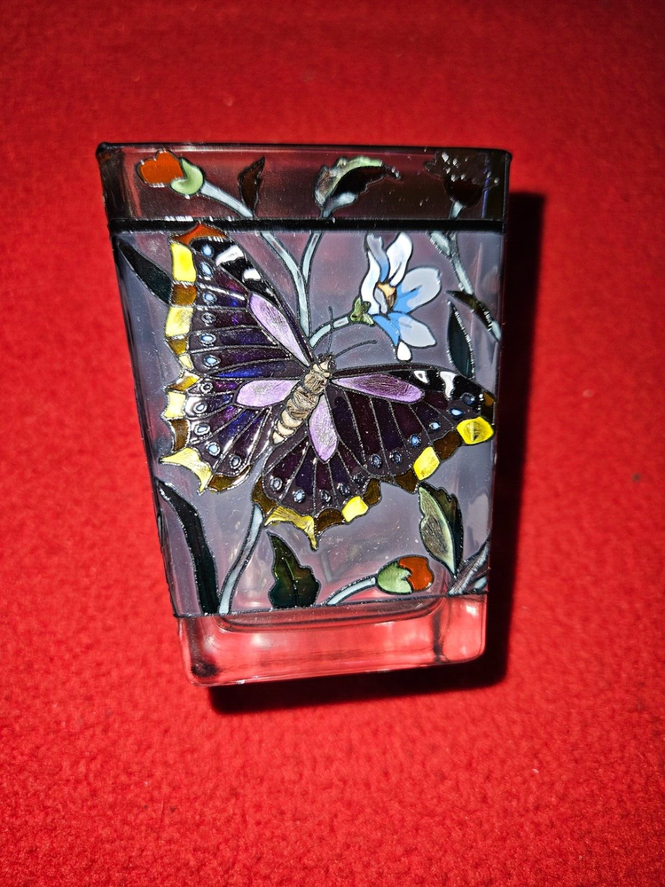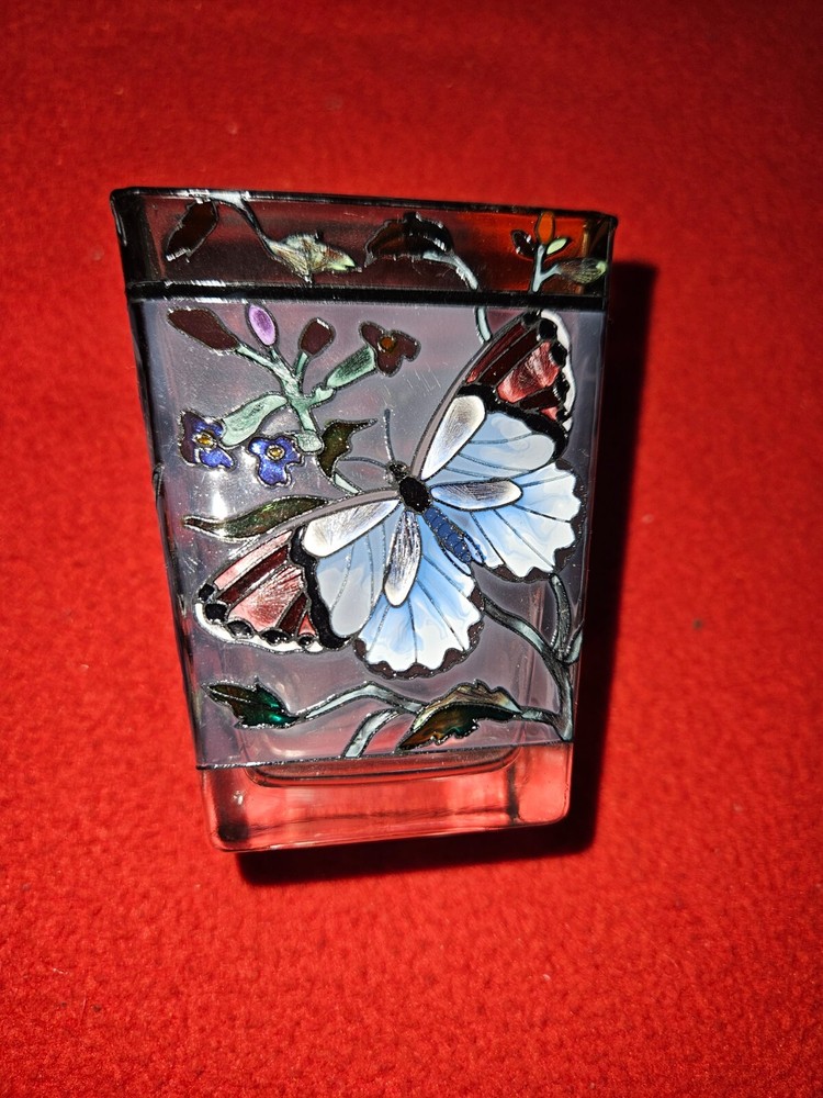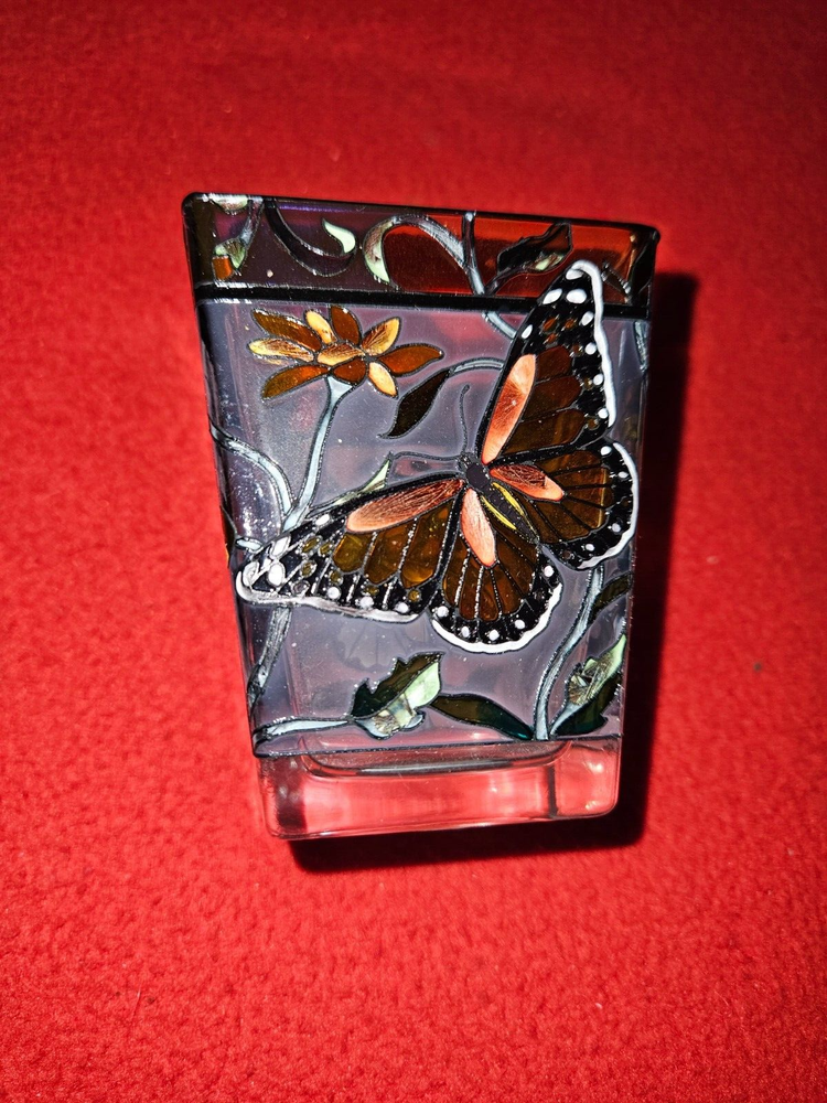 Add a touch of elegance to any room with this exquisite hand-painted AMIA glass votive candle holder. The intricate floral pattern adorned with vibrant butterflies creates a charming focal point when illuminated with a candle. Suitable for all occasions, this small, multicolored piece is crafted from quality glass and is designed to be a timeless treasure for your home.Carefully crafted and unboxed, this original piece from AMIA features a butterfly subject that exudes a serene and whimsical charm. It's a perfect accent for any space, bringing a splash of color and a warm inviting glow. Simply wipe with warm water to maintain its luster.