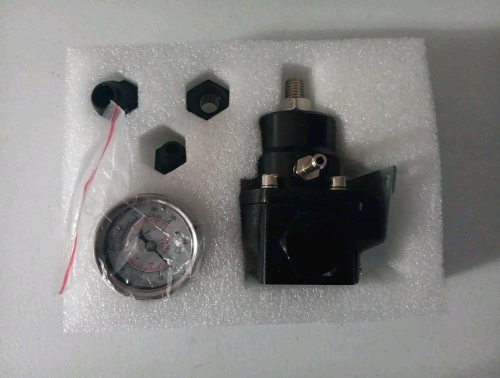 This is a new high pressure fuel regulator with boost, designed for performance vehicles. It includes an 8AN fitting, pressure regulator gauge, and is suitable for fuel injection systems. The regulator is adjustable and comes with a 1-year manufacturer warranty. Made in China by a brand known as "poy performance," this regulator is compatible with JDM adjustable fuel pressure regulators.