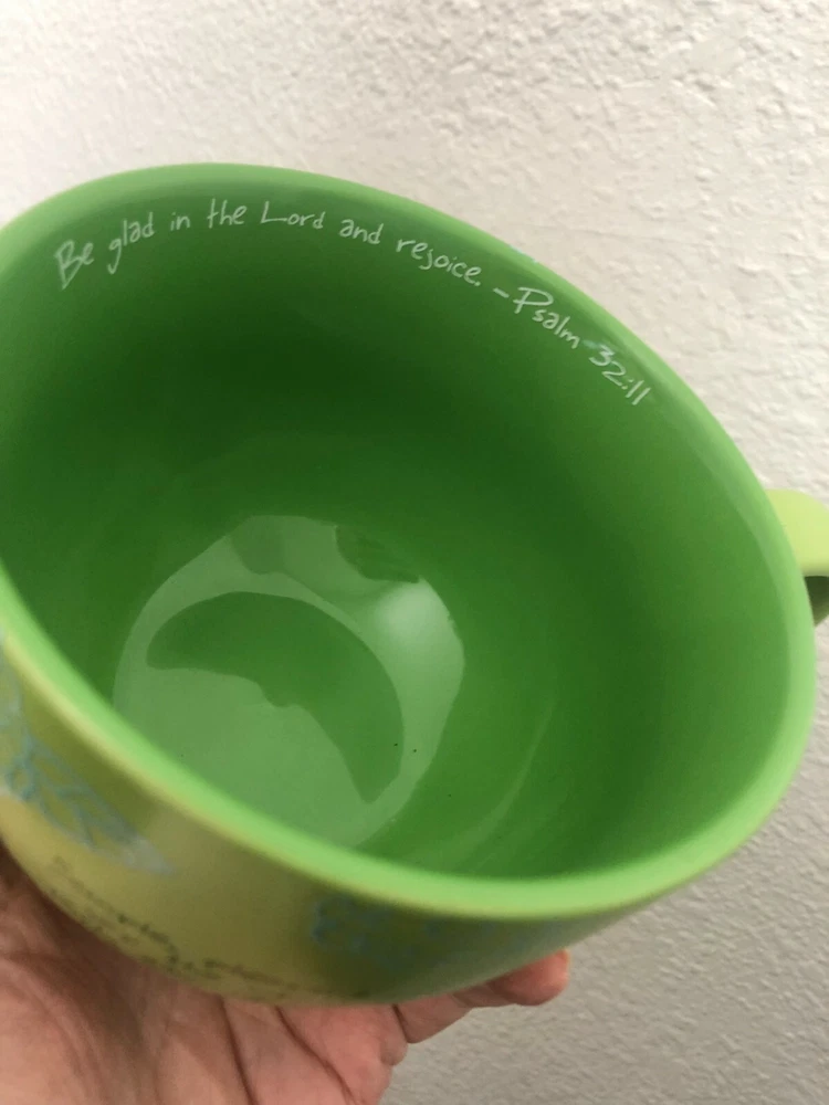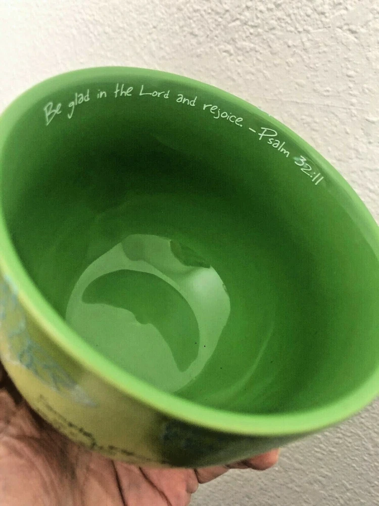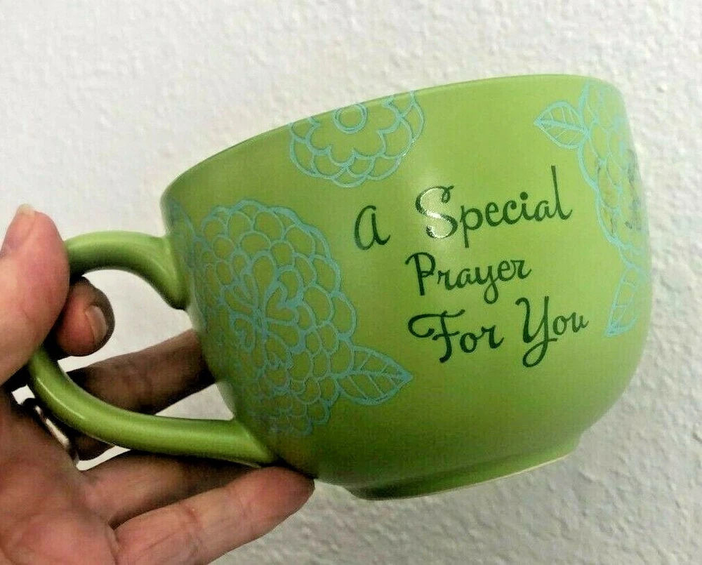ABBEY PRESS SPECIAL PRAYER MUG - PSALM 32:11 INSIDE MUG New Large capacity Green with blue embossed flor Reads" A Special Prayer For You" & prayer on reverse side & scripture inside Measures about 3.5" high, 4.75" across top opening Nice! SHIPPING TIME: We ship within 24 business hours of receiving your payment. ! COMBINED SHIPPING: We are always glad to combine auction purchases to save you on shipping. PET-FREE and SMOKE-FREE home. 1.2