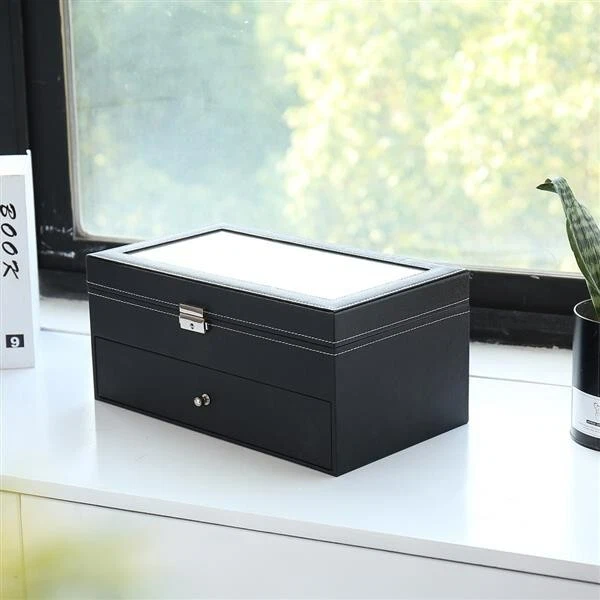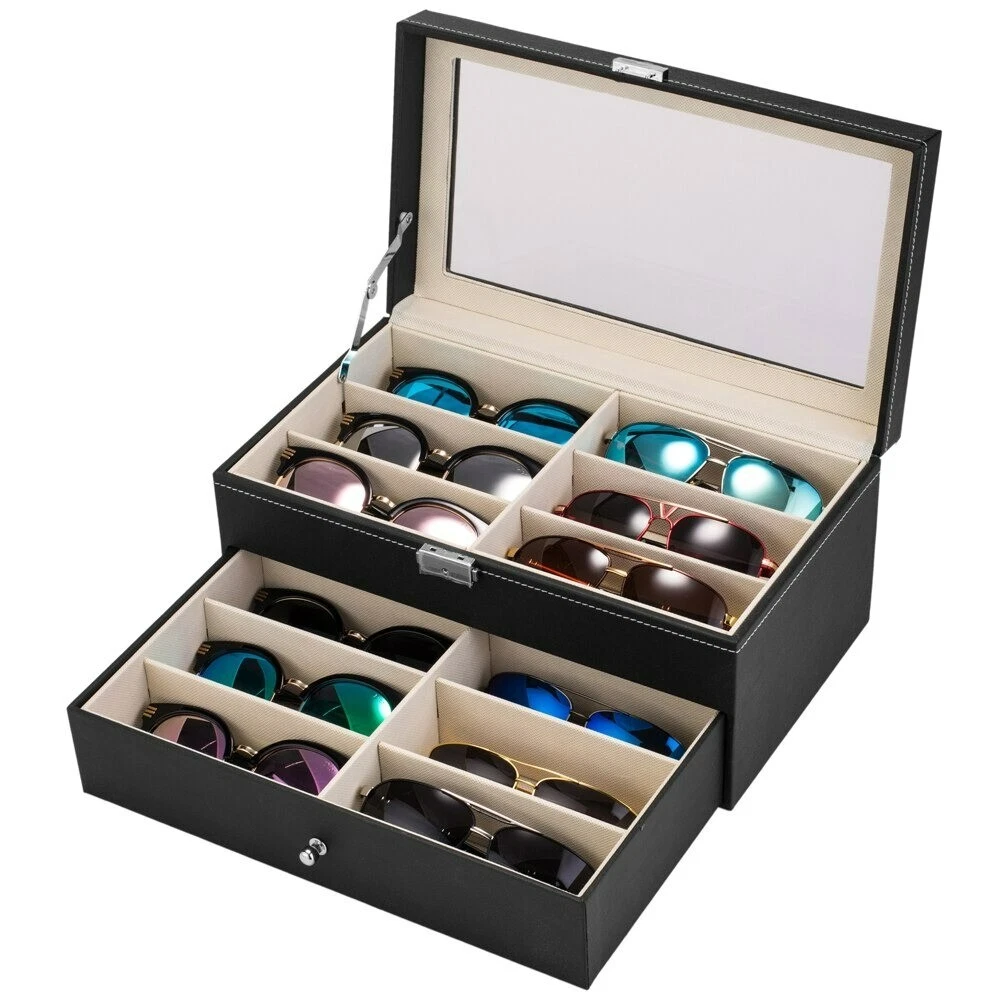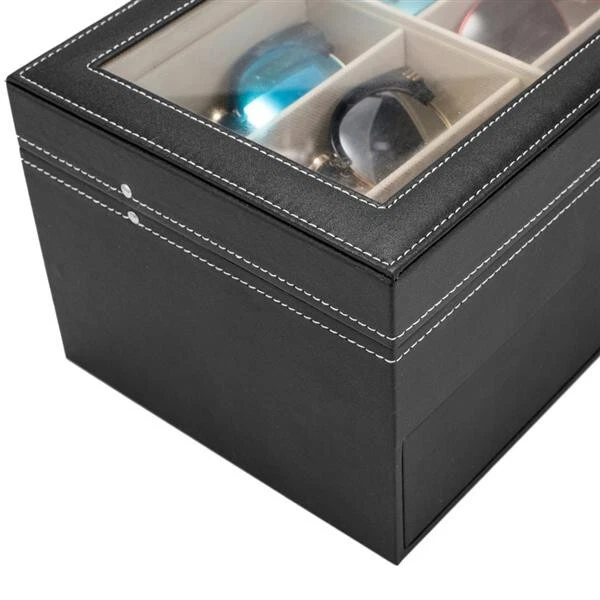 Introductions: Glasses Display Box is great for personal use, shop display and home decoration. What a great way to not only display your jewelry but also save time in the morning. Real glass top provides you with better view to choose your beloved jewelry. The lid has a metal hinge attached to keep it from falling back. Metal lock with keys makes sure of safety. This is a nice showcase and works well to keep your glasses safe and organized. Nice gift idea for girls, boys, women and men. Features: 1. High quality PU leather glasses and jewelry box with attractive appearance,simple structure,fine workmanship and sturdy construction 2. It's divided into plenty of unit space which are easy to clean and maintain,It will keep your Eyeglasses and sunglasses securely 3. This elegant glasses case allows you to show your glasses and other jewelry while protecting them away from dust,fingerprints,scratches and thieves 4. Clear glass top gives you a open view and you can find your favorite treasure in seconds with this unique glasses and jewelry box. Perfect for home and business use,and a wonderful gift idea Specifications: 1. Material: High Grade PU Leather,Medium Density Fiberboard 2. Window: Glass 3. Color: Black 4. Product Dimensions (L x W x H): 13.4"" x 7.6"" x 6"" (34 x 19 x 15 cm) First Tier: Slot Size (L x W x H): 6.2"" x 2.3"" x 1.6"" (15.7 x 5.8 x 4.1 cm) Second Tier: Slot Size (L x W x H): 6.2"" x 2.3"" x 1.6"" (15.7 x 5.8 x 4.1 cm) Packaging Includes: 1 x Glasses Display Box