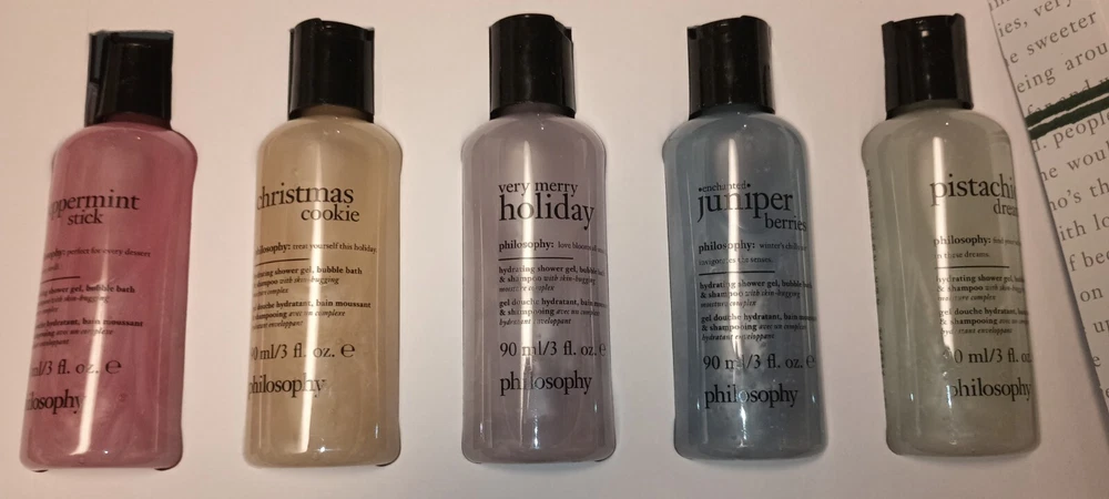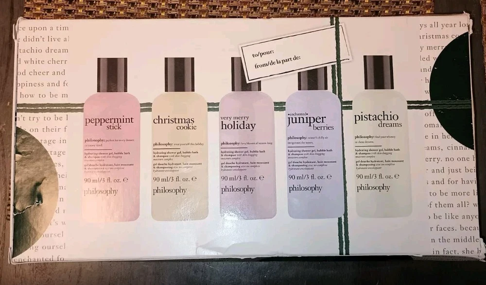 New Philosophy 5 Pc (3floz/90ml) Shower Gel Wishlist Gift Set Pistachio Holiday. peppermint stick hydrating shower gel, bubble bath, & shampoo 3oz christmas cookie hydrating shower gel, bubble bath, & shampoo 3oz very merry holiday hydrating shower gel, bubble bath, & shampoo 3oz enchanted juniper berries hydrating shower gel, bubble bath, & shampoo 3oz pistachio dreams hydrating shower gel, bubble bath, & shampoo 3oz New in box(minor dent)