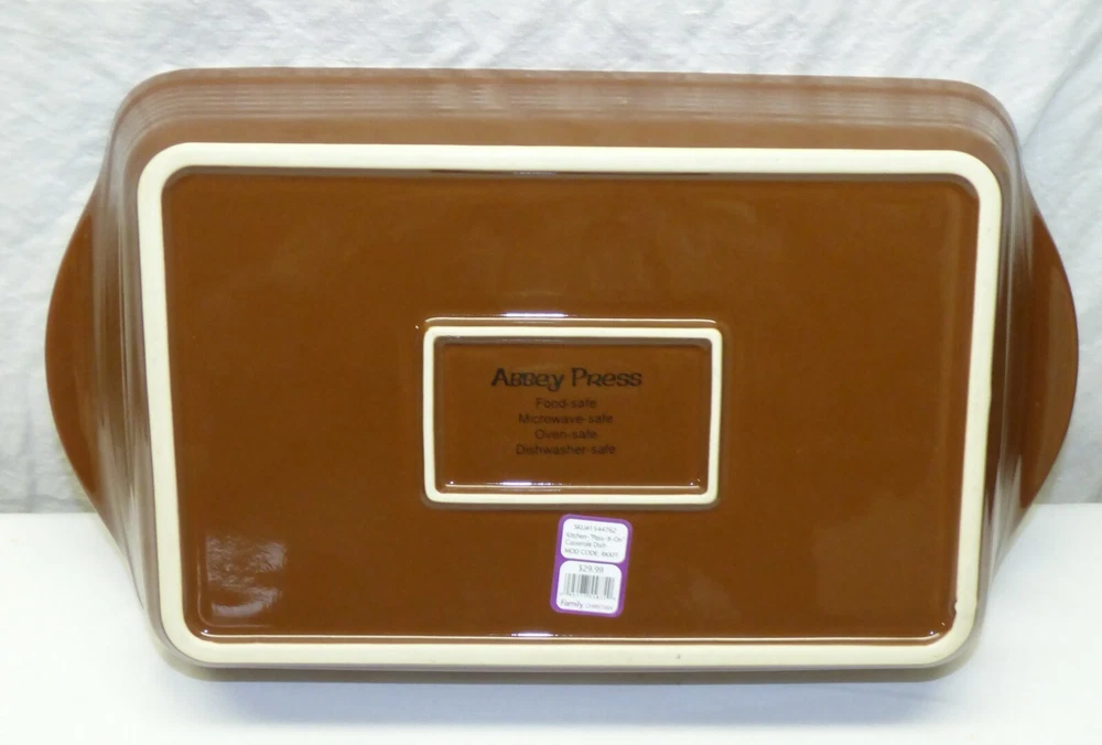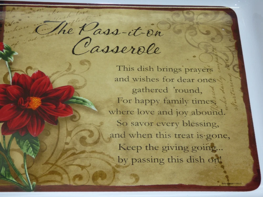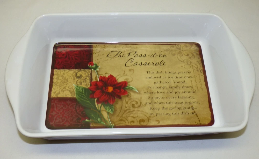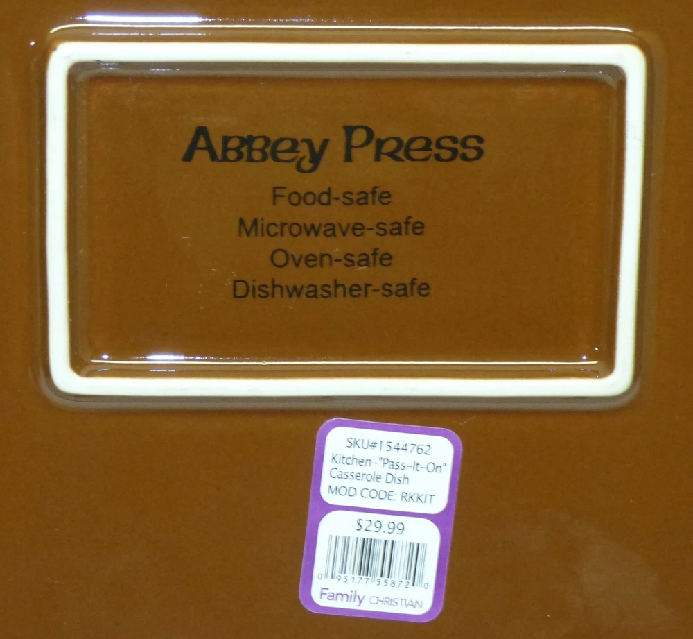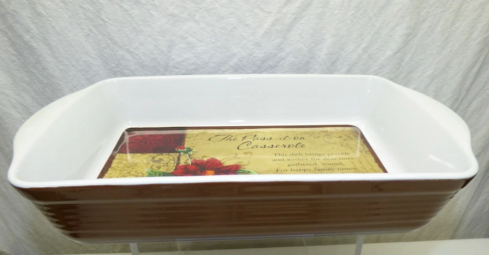 This is an unused casserole dish, app. 8 1/2 x 15 x 2 5/8 inches in size (exterior dimensions). Marked "The Pass-it-on Casserole....2013 Abbey Press...". Still has label on bottom. Excellent unused condition - still has label; little to no wear; see all 7 pics Items can be picked up in person at our office. Our home is smoke free. Wir sprechen Deutsch Nice addition to your collection! Please see our other listings. International buyers: customs/duty charges are buyer's responsibility and are not included in shipping cost! We will not falsify US customs documents.