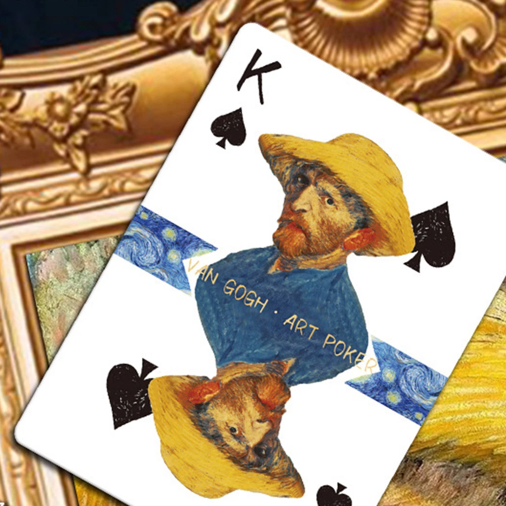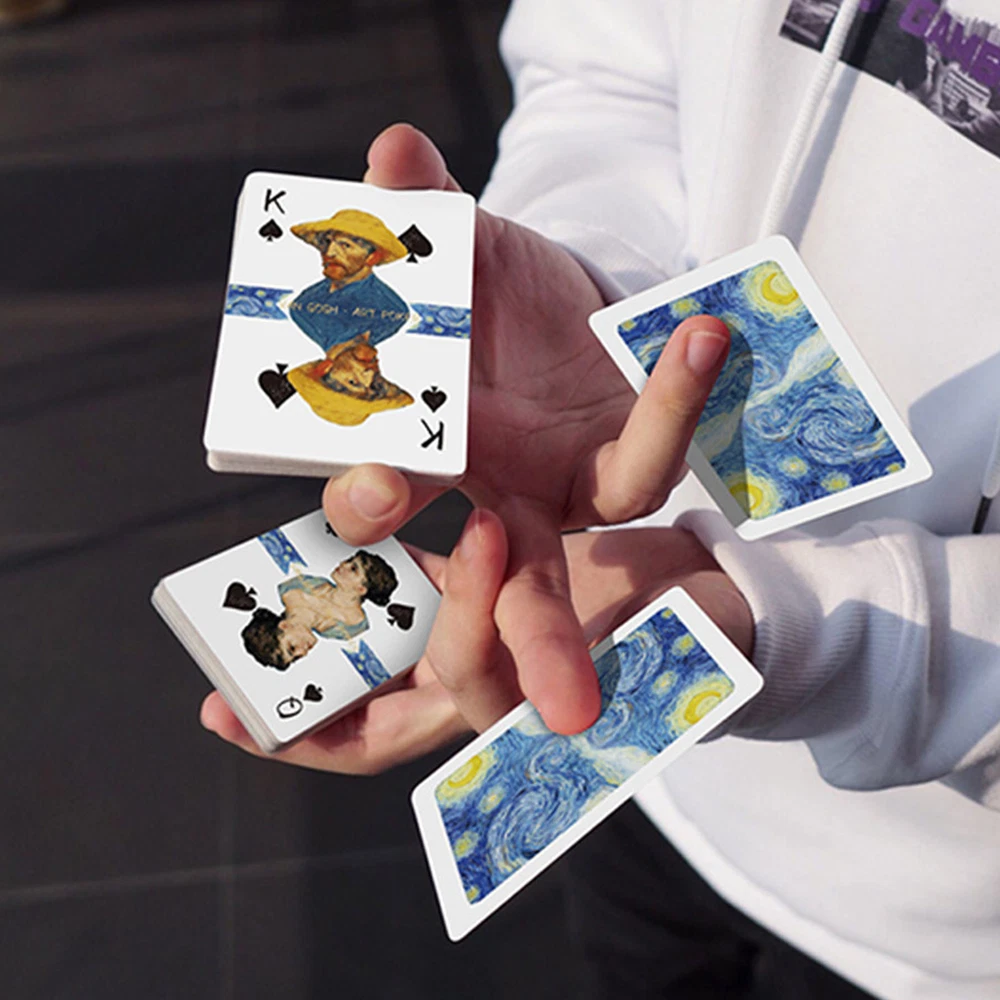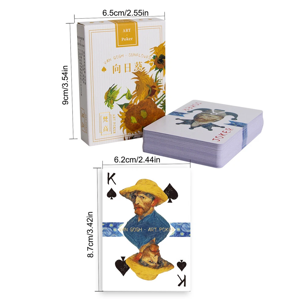 Bullet Points: Description: Made of superior material, and high-quality blue core paper, the card is anti-crease and more resistant to bending. Make you feel extremely comfortable and smooth. Bronzing technology to the brand box improves the overall appearance of the texture. Imitate ink stroke effect to increase the artistic effect of detail processing. Product Attributes: Name: Van Gogh Art Poker Material: paper products Package size: 90MM x 65MM / 3.5*2.6in Card size: 62MM x 87MM / 2.4*3.4in Packing List: 1*Van Gogh Art Poker