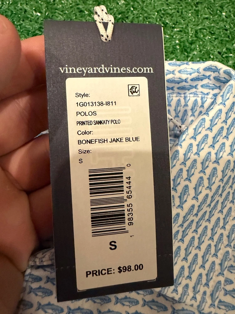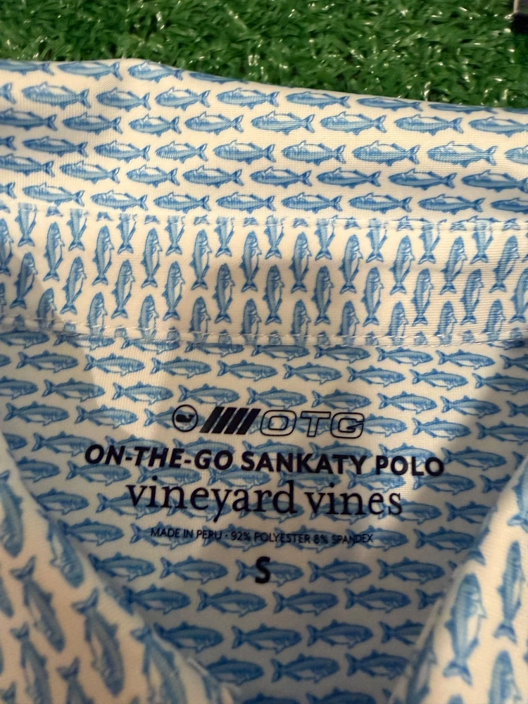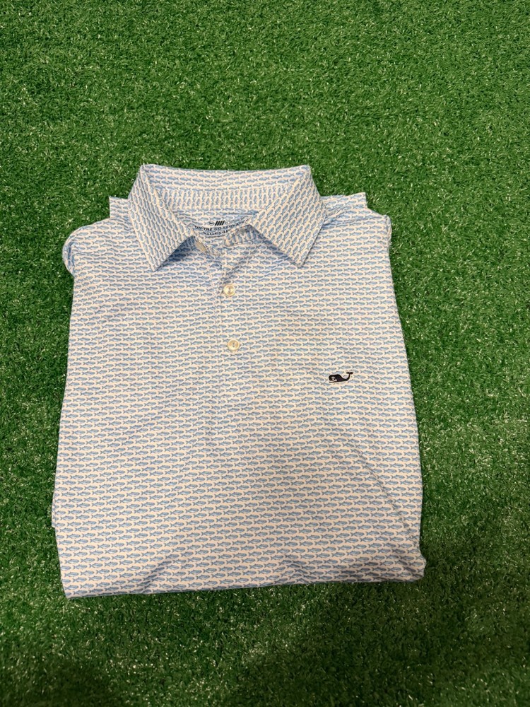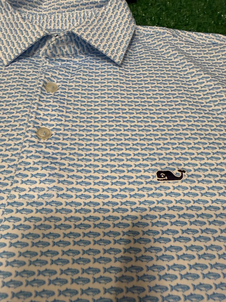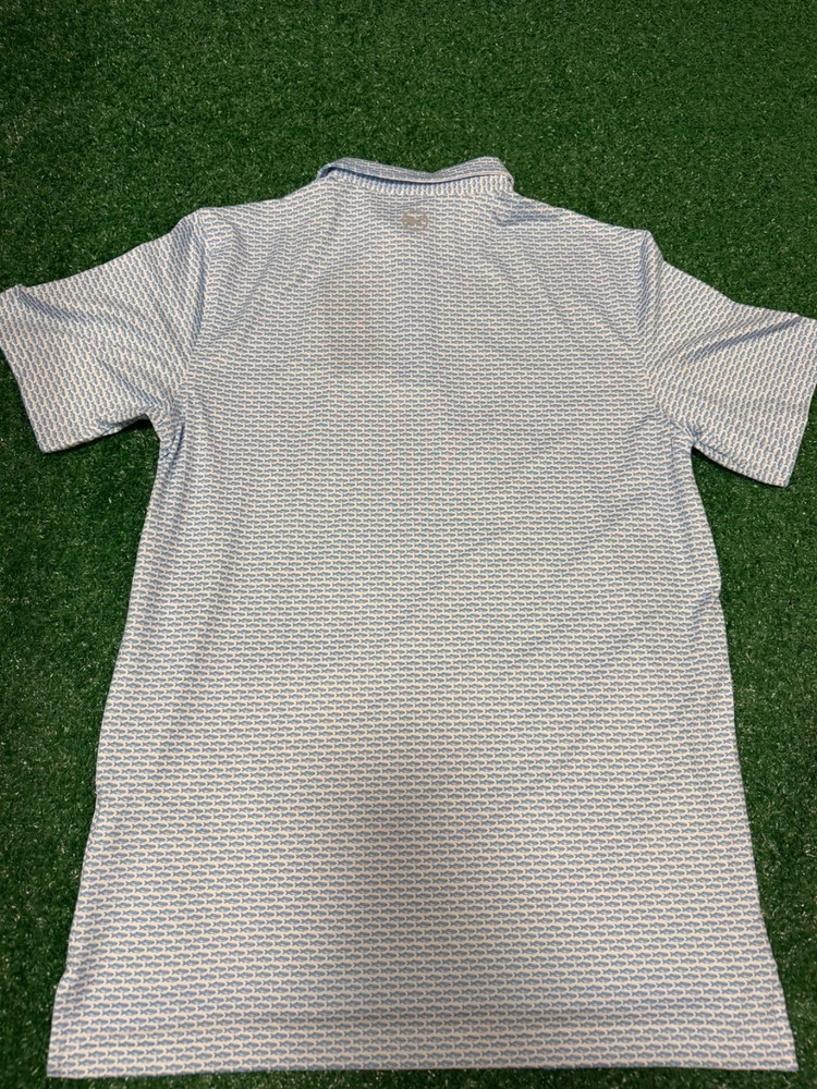 The New Vineyard Vines Golf Printed Sankaty Polo Shirt in Bonefish Jake Blue is a stylish and comfortable addition to any man's wardrobe. Made of polyester with a medium fabric wash, this short sleeve polo features a collared neckline, button closure, and a spread collar style. The shirt is designed for casual occasions, with a regular fit and a striped pattern that adds a touch of personality. Accented with the Vineyard Vines logo, this polo is ideal for a day on the golf course or any casual summer, fall, or spring outing. Machine washable for easy care, this polo is a versatile and practical choice for the modern man.