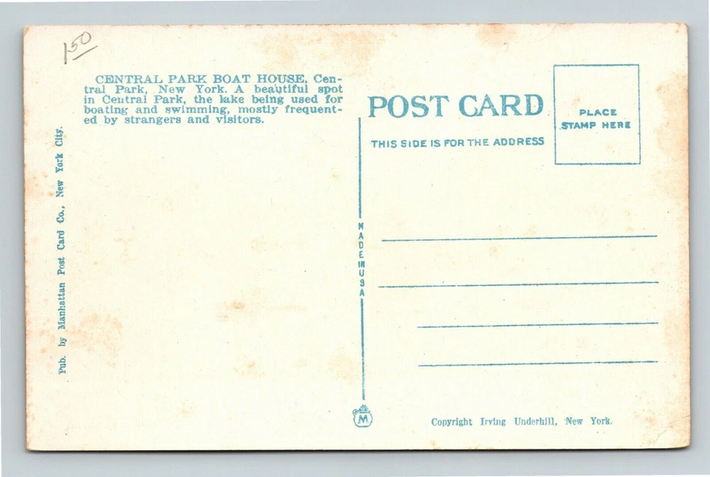 New York City, CENTRAL PARK BOATHOUSE, LAKE, VISITORS Vintage Souvenir Postcard
