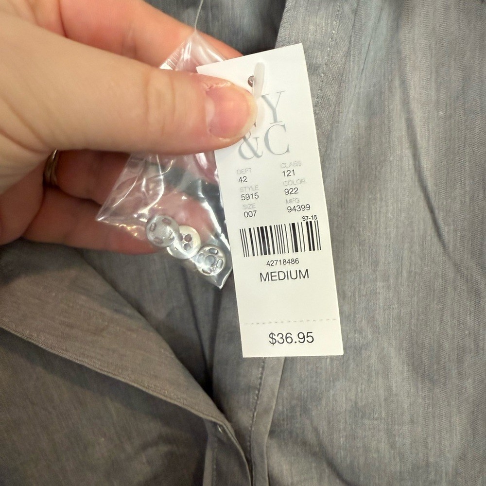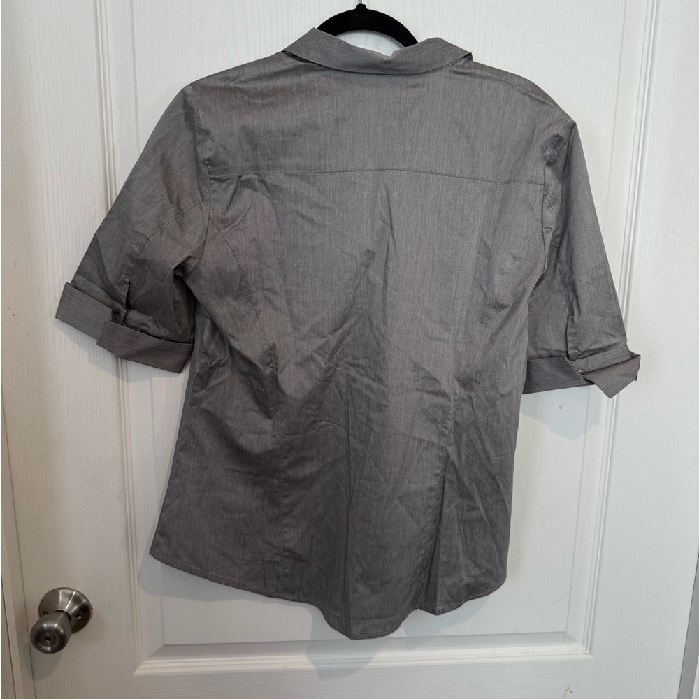 Stylish gray blouse. Features button-up front. Three-quarter sleeves with cuffs. Perfect for work or casual wear.nwt
