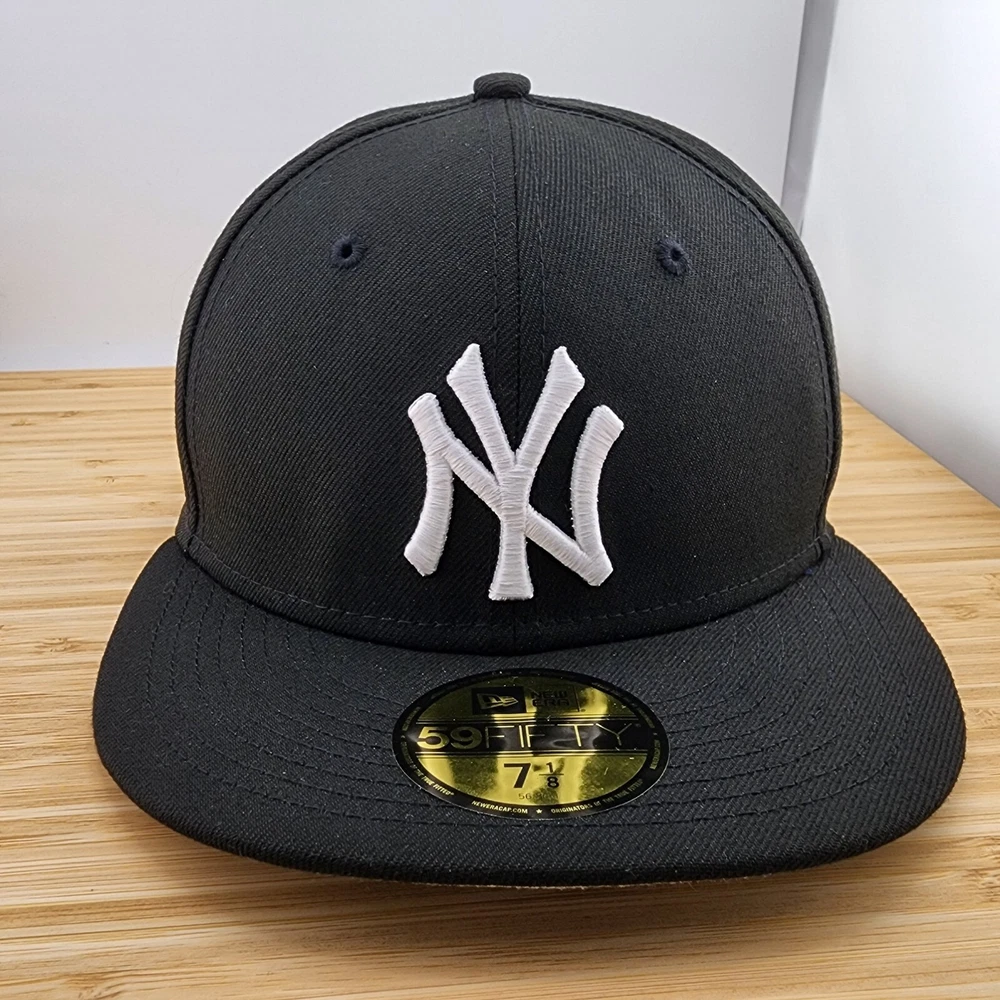 Show off your love for the New York Yankees with this black fitted hat from New Era. Featuring the iconic team logo and a solid pattern, this baseball cap is perfect for any sports fan. Made with high-quality polyester material, this hat is comfortable to wear and durable for everyday use. Whether you're headed to a game or just running errands, this MLB Yankees hat is the perfect accessory to add to your collection. Available in size 7 1/8, this hat is designed for men and is a great addition to any wardrobe. Get yours today and show your support for the New York Yankees!
