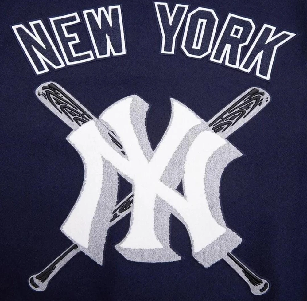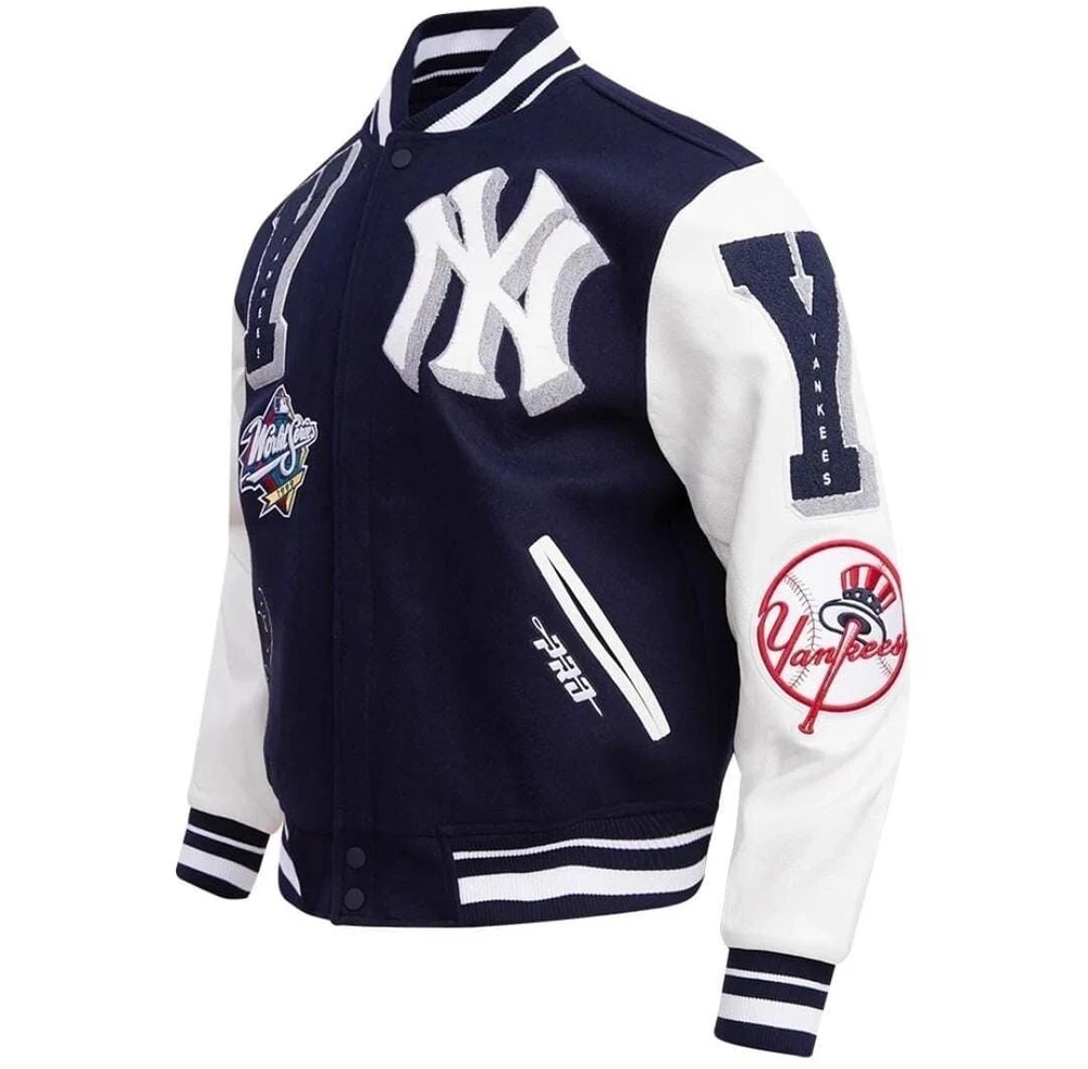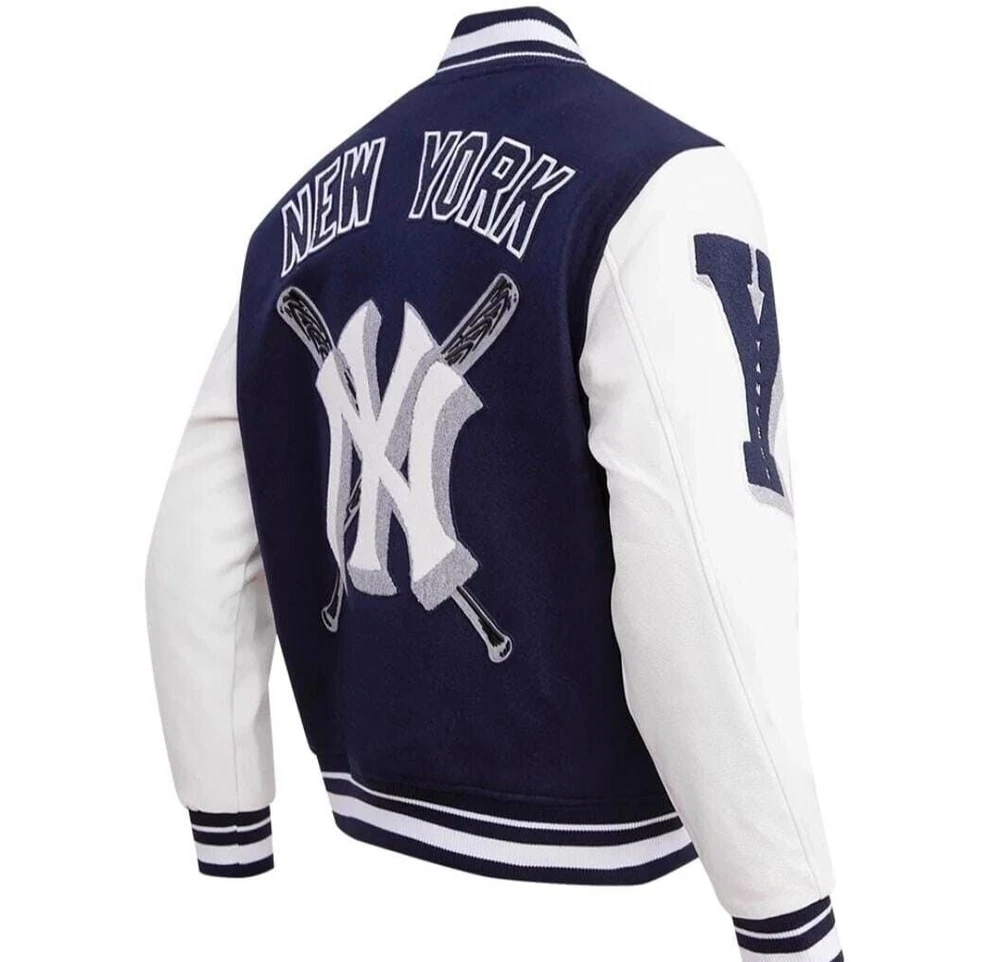 Show off your love for the New York Yankees with this stylish and unique varsity jacket. The jacket features a navy blue and white leather sleeve design with chenille embroidery that adds a touch of elegance to the overall look. It is made of high-quality wool and leather materials that ensure durability and comfort. This jacket is perfect for any baseball fan, especially those who support the New York Yankees. It is officially licensed and features the team's logo, making it a must-have for any fan. Whether you're going to a game or just want to show off your team spirit, this jacket is the perfect choice. NOTE ; Cuatom made jacket also available, send us your logo for custom jacket. Thanks