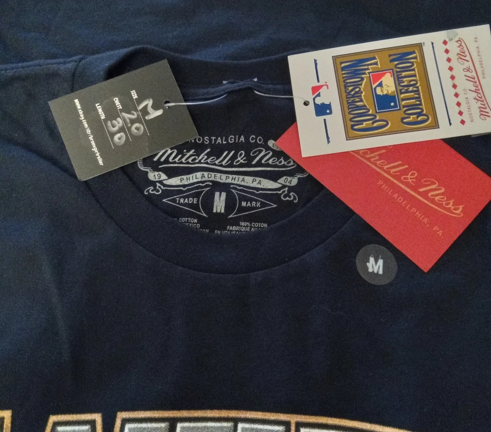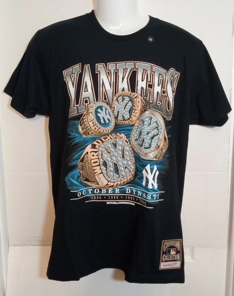 NWT. Show off your love for the New York Yankees with this Mitchell & Ness T-Shirt featuring the iconic October Dynasty. This shirt is perfect for any baseball fan and is made with high-quality materials. The shirt is designed with a chest measurement of 20 inches and a length of 30 inches, making it a comfortable fit for most people. The blue shirt is made in Mexico and features the famous Yankees logo on the front, along with the October Dynasty RINGS from 1996, 1998, 1999 and 2000. This shirt is a must-have for any collector or fan of the Yankees and is perfect for wearing to games or just around town. G14 BOX - 1285, 1286