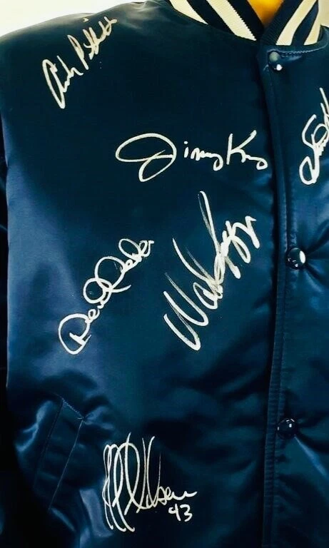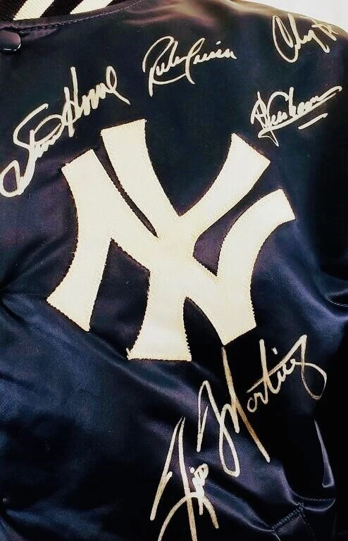 1996 World Series Champion New York Yankees team issue Starter game jacket autographed by multiple players in a silver tip felt pen. Autographs really pop in the silver color and are super clean free of any streaking or fading. Would look stunning displayed in a nice shadow box. Players autographs from the 1996 World Series Championship team include Yankee HOF legend Derek Jeter and Wade Boggs, along with notable star players Andy Pettitte, Tino Martinez, Andy Fox, Jeff Nelson, and others. This is a unique piece with very few autographed game jackets seen in the market, as well as this was the first World Series win for this Yankee team that emerged as a dynasty team. Comes with JSA authentication and COA. Don’t miss this opportunity to add this unique autographed piece of baseball history to your Bronx Bomber collection!!