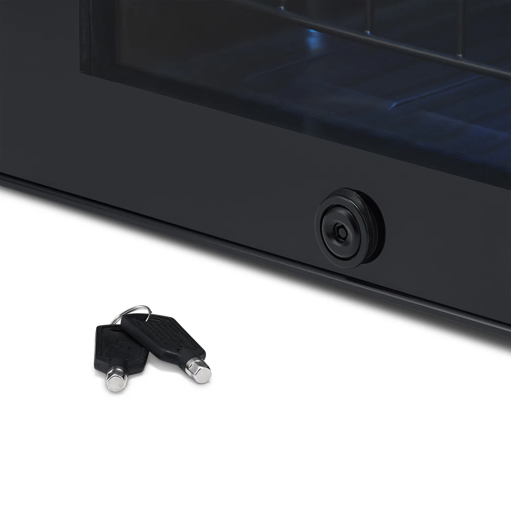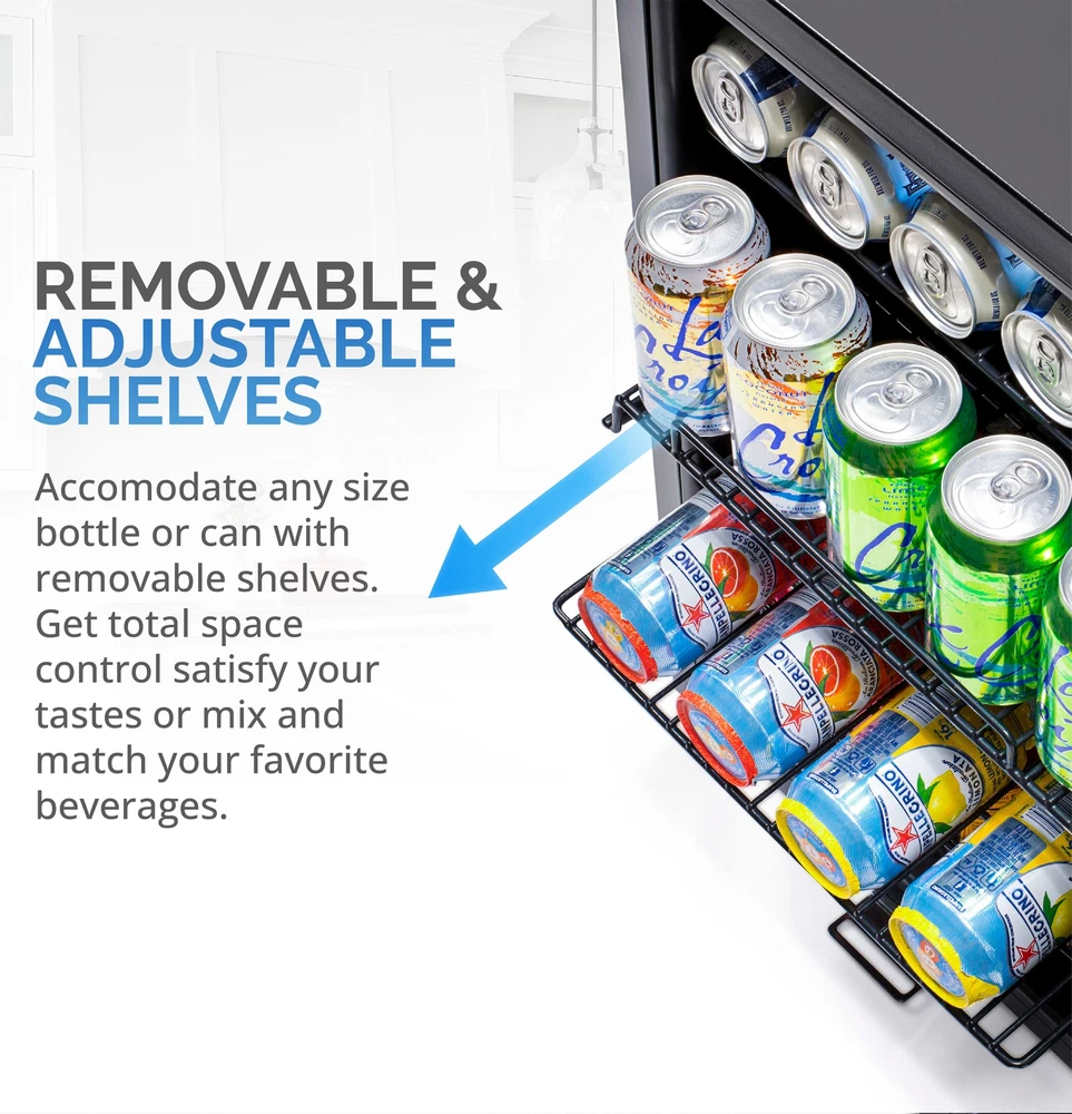Keep all your favorite beverages perfectly chilled and ready to serve in the Newair 90 Can Compact Beverage Fridge. The freestanding design is ready to use out of the box, and adjustable shelves let you create customized storage for different sized cans and bottles. 1. Powerful and Capable Compressor: The Newair 90 Can Compact Beverage Fridge features a powerful compressor cooling system that keeps your drinks at a consistently chill 37 degrees for optimum refreshment. Choose from 7 custom thermostat settings to keep beer and soda at the perfect temperature for serving. 2. Compact Design Has Room for 90 Standard Cans: At just 16.9 inches wide and 25.4 inches high, this little fridge packs a big punch. With the capacity to hold up to 90 standard cans, you can fit all the drinks you want inside - without having to redesign your kitchen or home bar to make room for a larger appliance. 3. Removable Storage Shelves for Flexibility: The interior shelves of the Newair 90 cans freestanding beverage cooler can be adjusted to make room for oversized bottles and containers of all shapes and sizes so you can keep all your drinks in one place. The interior LED light is also adjustable. 4. The Use-it-Anywhere Beverage Fridge: The Newair 90 Can Compact Beverage Fridge doesn't require special installation or new cabinets to get started - just plug it in and you're ready to go. Its sleek black finish and LED interior light guarantee that it looks great anywhere. 5. Double-Paned Doors Keep It Cold: Double-paned glass doors provide outstanding insulation to keep all that cold air inside. They also provide on-trend good looks and an easy way to find exactly the right beverage when company calls. 6. Keep Drinks Away from Curious Kids: Whether you have toddlers or teens, not every drink is appropriate for every member of the household. The Newair 90 Can Compact Beverage Fridge in Black comes equipped with an integrated lock and key to keep adult beverages safely out of curious hands. It's the perfect beverage fridge for families who have safety in mind.