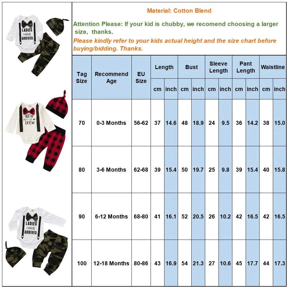 Newborn Baby Three-Piece Camouflage Clothing Set "Introducing the Cute 3PCS Set Newborn Baby Boy Clothes - Perfect for Your Little Prince!Celebrate your baby boy's arrival in style with our adorable 3-piece set, designed to keep him cozy and charming all year round. Featuring a long sleeve bodysuit with a choice of collar styles, a snug pants set, and an adorable cap, this set offers the perfect ensemble for any occasion.Crafted from premium cotton blend fabric, each piece ensures a gentle touch against your baby's delicate skin, providing unparalleled softness and comfort. With eye-catching camouflage or plaid patterns adorning each garment, your little one is sure to stand out in style.Convenience meets functionality with snap buttons on the bodysuit, allowing for quick and easy changes. Available in sizes ranging from 0-3M to 12-18M, our 3PCS Set Newborn Baby Boy Clothes guarantees a perfect fit for every stage of your baby's growth, ensuring years of fashionable comfort.Whether it's a sunny day or a chilly evening, this versatile set is suitable for any season, making it a must-have addition to your baby's wardrobe.Welcome your bundle of joy with the perfect outfit - shop our Cute 3PCS Set Newborn Baby Boy Clothes today!" Newborn Baby Three-Piece Camouflage Clothing Set "Introducing the Cute 3PCS Set Newborn Baby Boy Clothes - Perfect for Your Little Prince! Celebrate your baby boy's arrival in style with our adorable 3-piece set, designed to keep him cozy and charming all year round. Featuring a long sleeve bodysuit with a choice of collar styles, a snug pants set, and an adorable cap, this set offers the perfect ensemble for any occasion. Crafted from premium cotton blend fabric, each piece ensures a gentle touch against your baby's delicate skin, providing unparalleled softness and comfort. With eye-catching camouflage or plaid patterns adorning each garment, your little one is sure to stand out in style. Convenience meets functionality with snap buttons on the bodysuit, allowing for quick and easy changes. Available in sizes ranging from 0-3M to 12-18M, our 3PCS Set Newborn Baby Boy Clothes guarantees a perfect fit for every stage of your baby's growth, ensuring years of fashionable comfort. Whether it's a sunny day or a chilly evening, this versatile set is suitable for any season, making it a must-have addition to your baby's wardrobe. Welcome your bundle of joy with the perfect outfit - shop our Cute 3PCS Set Newborn Baby Boy Clothes today!" × × × × × × × × × × × × × × × × × × Tell a friend Watch now Postage info Click the Postage tab above the listing description for more info FREE Postage Click the Postage tab above the listing description for more info! Additional delivery notes PICK UP OPTION Sorry, our items are NOT available for pick-up. PAYING VIA PAYPAL We accept PayPal on our all our items so you can shop with confidence. Simple choose the PayPal option when proceeding through the checkout. Additional Information No additional information at this time Ask seller a question You might also like Spill-Proof Kids Gyro Bowl™ 2.0 Adjustable Baby Breastfeeding Pillow Baby Wooden Teeth Organizer Newborn Baby Two-Piece Sweat Set Contact To contact our Customer Service Team, simply click the button here and our Customer Service team will be happy to assist. Ask seller a question © Angel Carez Postage Shipping is FREE for this item Payment Accepted Payment Methods PayPal Returns Returns are accepted Items must be returned within 30 days of the auction ending Buyer will pay for return shipping. eBay integration by