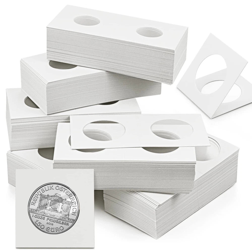Nexxxi 300 Pcs Cardboard Coin Holder, 6 Sizes 2 by 2 inch currency holders for Coin Collection Supplies Great gift for your friends, especially for coin collecting lover! Specifications: Material: cardboard Cardboard Size: 3.94 x 1.97 inch/ 10 x 5 cm Folded Size: 1.97 x 1.97 inch/ 5 x 5 cm Windows Diamete: 20.5 mm/ 0.8 inch, 23 mm/ 0.9 inch, 25 mm/ 0.98 inch, 27.5 mm/ 1.08 inch, 31.5 mm/ 1.24 inch, 40 mm/ 1.57 inch Quantity: 300 pcs Package includes: 300 x Cardboard Coin Holder Made of high-quality cardboard, safe crystal clear windows, offer great protection for your coins. 6 different sizes can holder most popular sizes includes 50 penny/ dime, 50 nickel, 50 quarter, 50 half dollar, 50 small dollar, 50 large dollar. Just fold with coin inside, then seal with staples or tape, you can note coin details. Great coin collection supplies, they are safe for long-term storage, inexpensive and practical. Package includes 300 pcs coin holders in 6 assorted sizes, 50 pcs for each size.