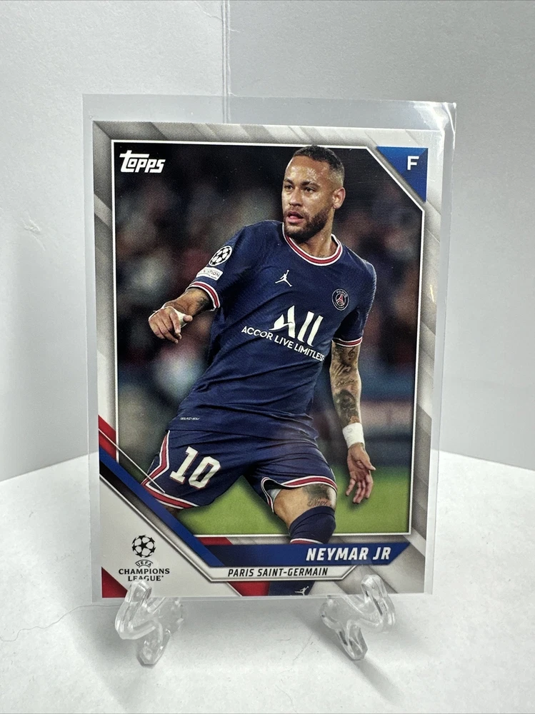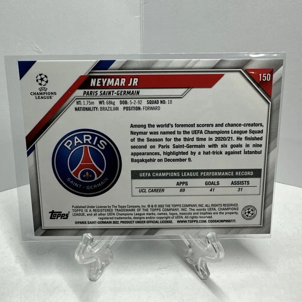 This Neymar Jr. 2021-22 Topps UEFA Champions League #150 PSG trading card is a must-have for any soccer fan. Featuring Neymar Jr. in his Paris Saint-Germain jersey, this card is made of high-quality card stock and is 20 Pt. thick. It is an original Topps card from the 2021 set and is in excellent condition for any collector or fan. This card commemorates Neymar Jr.'s participation in the UEFA European Football Championship and is part of the base set for the Topps collection. It is an English language card and is manufactured in an unknown location. The print run is unknown, but this card is an exclusive trading card single. Get your hands on this rare and highly sought-after card today!