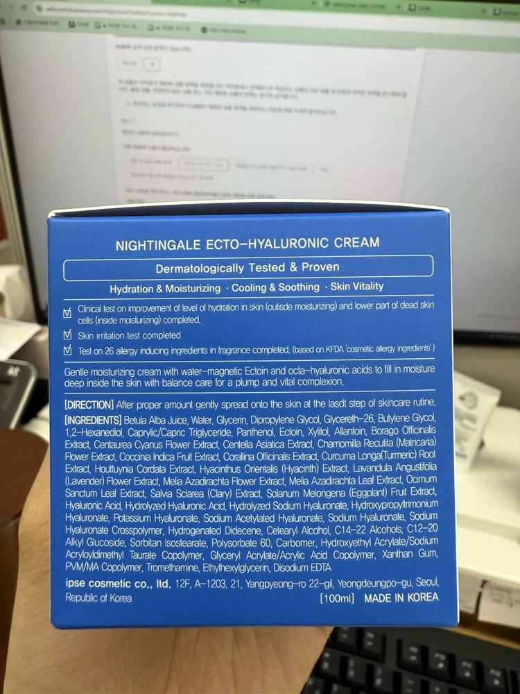 Nightingale Ecto-Hyaluronic Cream with 8 layer Hyaluronic Acid, Ectoin, Daily Face Moisturizer For Dry Skin, Fragrance Free, Hypoallergenic, Allergen Free, Cruelty Free, Vegan, Korean Skin Care - Buy Now with Fast Shipping! Nightingale Ecto-Hyaluronic Cream with 8 layer Hyaluronic Acid, Ectoin, Daily Face Moisturizer For Dry Skin, Fragrance Free, Hypoallergenic, Allergen Free, Cruelty Free, Vegan, Korean Skin Care Product Details Brand: Nightingale Item Volume: 100 Milliliters Item dimensions L x W x H: 1.57 x 1.57 x 1.57 inches Age Range (Description): 어른 Special Feature: Hypoallergenic Product Dimensions : 1.57 x 1.57 x 1.57 inches; 1.76 Pounds Item model number : 200189000 Manufacturer : Nightingale Key Features ✅ [Clinically Proven to Boost Skin Hydration] Proven through clinical testing to enhance moisture levels both deep within the skin (inner hydration) and on its surface (outer hydration), ensuring all-day hydration and a healthy glow. ✅ [Deep Hydration & Moisture Barrier] The 8-layered hyaluronic acid moisture-locking system provides deep hydration, while Ectoin, a natural stress-protective molecule, creates a moisture barrier to enhance retention, keeping skin hydrated for hours. ✅ [Clear and Hydrated Skin] Enriched with 42.3% birch sap, rich in amino acids and minerals, to refresh and hydrate the skin, improving clarity and moisture. Patented soothing and moisturizing ingredients help relieve dry skin. ✅ [Rapid Calming] Contains Centella Asiatica extract, allantoin, and xylitol, known for their excellent soothing properties. Helps quickly calm irritated and flushed skin, reducing redness and restoring the skin to a healthy state. ✅ [100% Vegan & Clinically Tested] Clinically proven to improve double moisture retention. Certified vegan cosmetic with no animal ingredients or testing. Allergen-free, fragrance-free, paraben-free, sulfate-free, and cruelty-free formula, suitable for sensitive skin. Product Description
