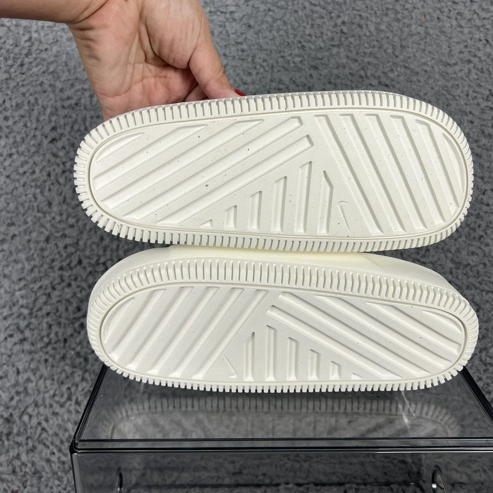 Elevate your casual style with these white Nike Calm Slides in size 5 for women. Designed with a white solid pattern and the Nike logo as an accent, these slide-on sandals are perfect for travel, activewear, and casual occasions. The low heel height and flat style make them comfortable for everyday wear, while the rubber outsole, insole, and upper materials provide durability and support. These sandals are great for sports and college-themed activities, with a cloud-like feel that will make your feet feel relaxed. The standard shoe width ensures a comfortable fit for most women's shoe sizes. Get ready to enjoy the summer, fall, and spring seasons in style with these casual Nike Calm Slides.