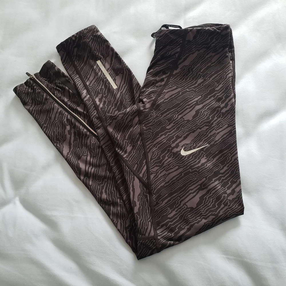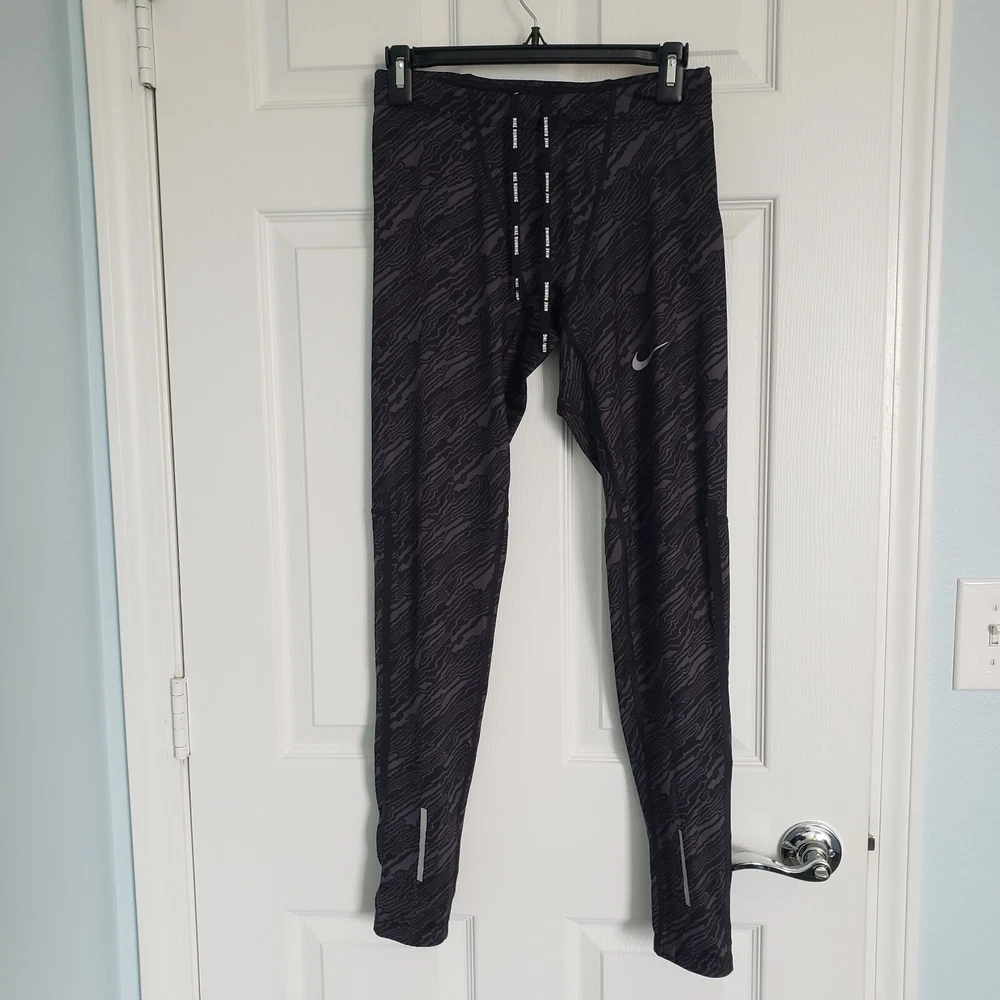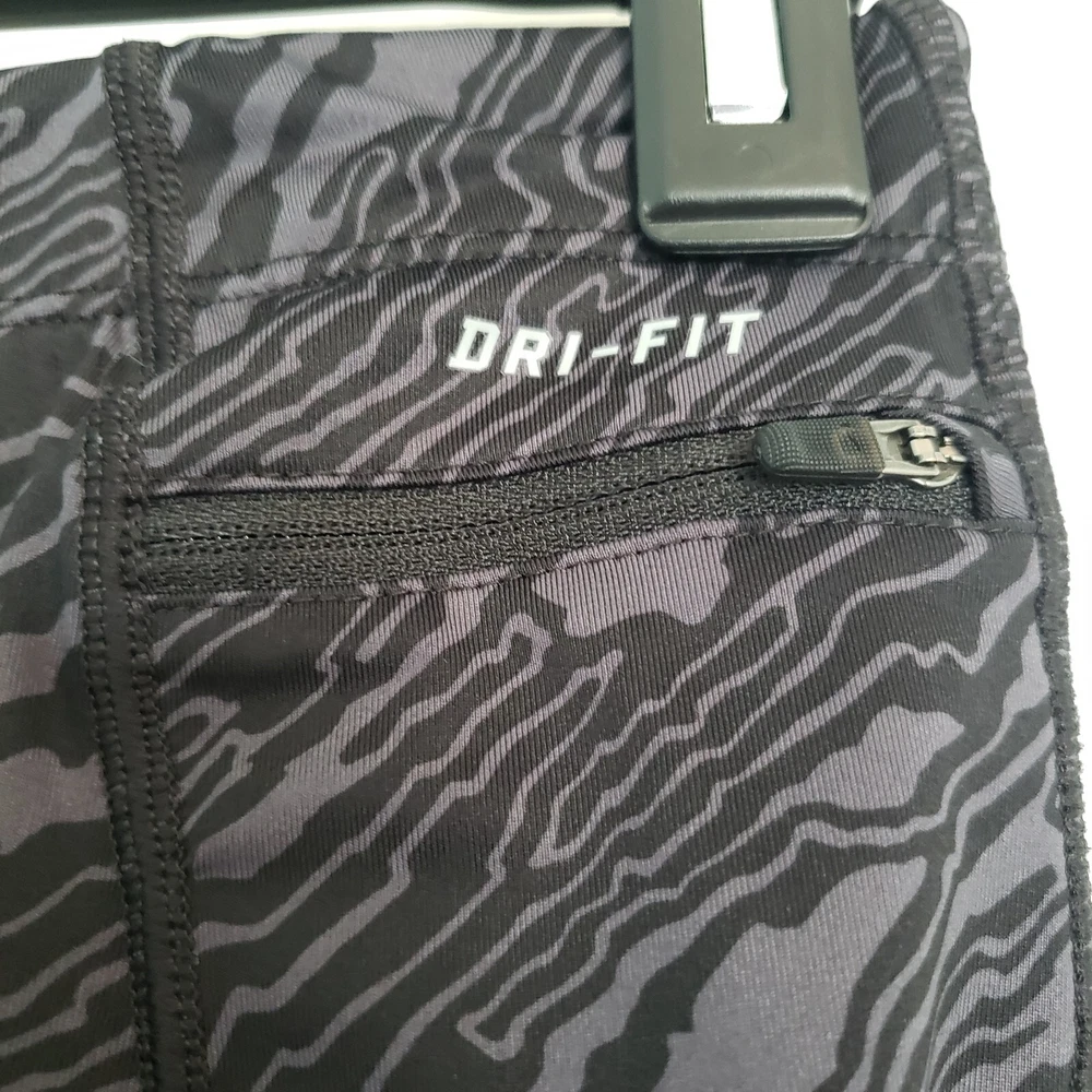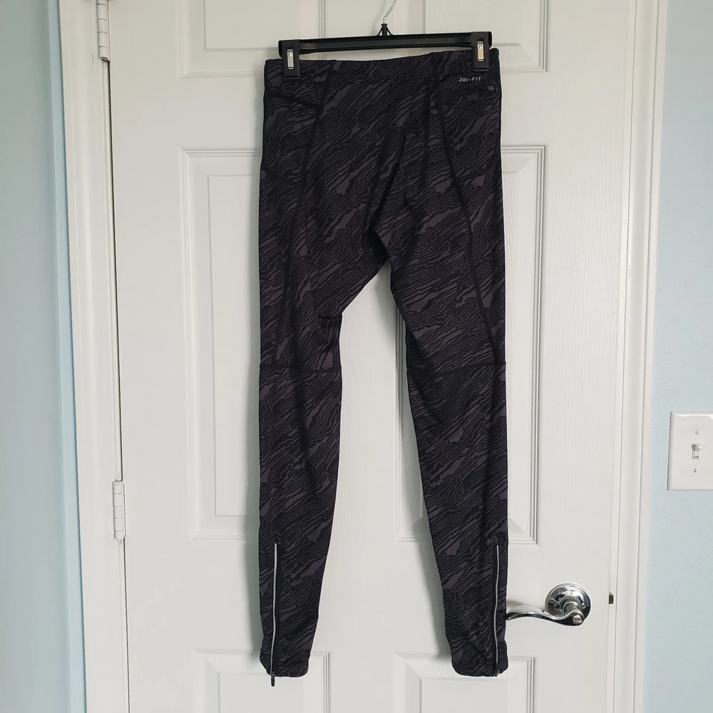 Nike Dri Fit Compression Camo Running Leggings Size M. Zip Ankle, Drawstring Waist. Two back pockets, one with zip close. Reflective tape when running in low light. Black/Gray Camo Pattern. Excellent condition. Returns accepted - buyer pays return shipping.